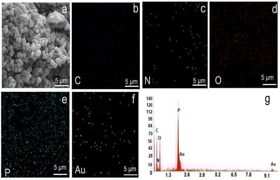 (a) SEM image of PVIB, (b) Carbon (C), (c) Nitrogen (N), (d) Oxygen (O), (e) Phosphorus (P), and (f) Gold (Au); (g) EDS mapping of PVIB elemental distribution obtained from EDS spectra.