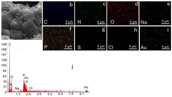 (a) SEM image of PVIBPR, (b) Carbon (C), (c) Nitrogen (N), (d) Oxygen (O), (e) Sodium (Na), (f) Phosphorus (P), (g) Sulphur (S), (h) Chloride (Cl), and (i) Gold (Au); (j) EDS mapping of PVIBPR Elemental distribution obtained from EDS spectra.