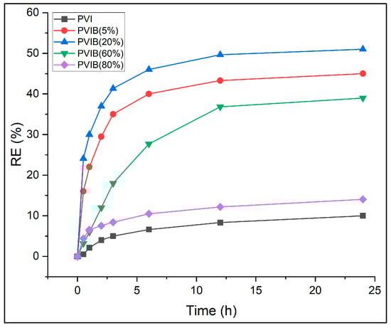 The adsorption performance of PVI and PVI-based composite adsorbents modified with different loadings (5–80%) of bis[2-(methacryloyloxy)ethyl] phosphate (B) was investigated for the removal of PR dye. Batch adsorption tests were carried out using a fixed dye concentration of 100 mg L−1 and a uniform adsorbent mass of 20 mg. The tests were monitored for 24 h to evaluate time-dependent color removal efficiencies. Dye removal was quantified at several time intervals (0.5, 1, 2, 3, 6, 12, and 24 h) at 25 °C, and removal efficiencies of adsorbent formulations were compared in Figure 7.