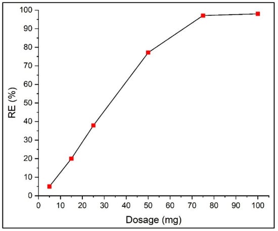 The effect of PVIB20% dosage on the adsorption of PR dye was investigated at an initial dye concentration of 100 mg L−1, 25 °C, and a contact time of 3 h, with dosages ranging from 5 to 100 mg. The results demonstrate a clear correlation between adsorbent dose and dye removal efficiency (Figure 8). At the lowest dose of 5 mg, only 5% of PR was removed, reflecting the insufficient number of available adsorption sites relative to dye molecules. Increasing the dosage to 15 and 25 mg enhanced the removal efficiency to 20% and 37.9%, respectively, due to the increased surface area and greater number of active imidazole and phosphate functional groups available for electrostatic interactions and hydrogen bonding with PR molecules. A more pronounced increase was observed at 50 mg, where removal efficiency reached 77.1%, indicating a significant improvement in dye–adsorbent interactions as surface sites became more abundant.