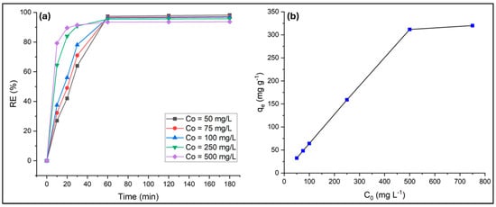 At low concentrations (50–100 mg L−1), removal efficiency increased steadily in the first 30 min (64–78%) and reached near-complete removal (96–98%) within 60 min (Figure 9a). This demonstrates that the available active sites on PVIB20% were sufficient to capture almost all dye molecules at lower loadings. At higher concentrations (250 and 500 mg L−1), adsorption was initially rapid, achieving over 90% removal within 30 min. However, equilibrium was reached at slightly lower efficiencies (93–96%) compared to dilute solutions. This reduction is explained by competition among excess dye molecules for a limited number of active sites, leaving some dye unabsorbed even at extended contact times. The sharp rise in removal efficiency during the early stages indicates fast surface adsorption, likely driven by strong electrostatic interactions between the negatively charged phosphate groups of the dye and the positively charged imidazole groups of PVIB20%. Beyond this stage, slower intraparticle diffusion or site saturation possibly limited further uptake. An optimized contact time of 60 min is selected for further experiments, since removal efficiencies across all initial concentrations already reach ~93.5–97.4% by 60 min and change by less than ~1% thereafter.