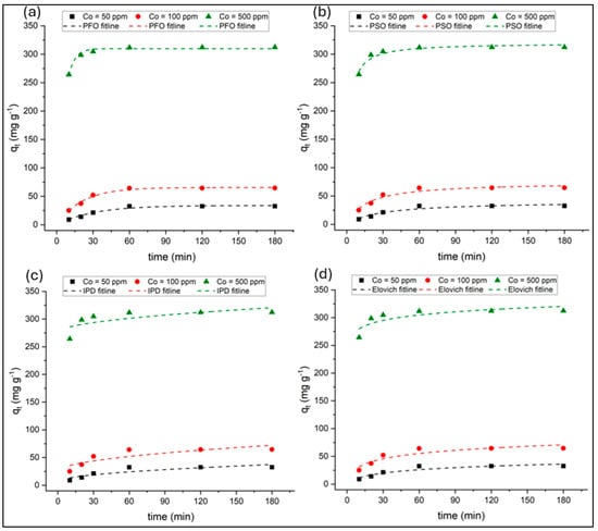 Adsorption kinetics were systematically evaluated using non-linear regression to ensure statistically robust parameter estimation at three initial dye concentrations (C0 = 50, 100, and 500 mg L−1) over contact times ranging from 10 to 180 min at 25 °C. The kinetic parameters and model fit metrics for the pseudo-first-order (PFO), pseudo-second-order (PSO), intraparticle diffusion (IPD), and Elovich models were determined for their respective standard equations and graphical plots, as outlined in Table 1. The calculated values are summarized in Table 3, while the standard model fits to the experimental data are presented in Figure 10.