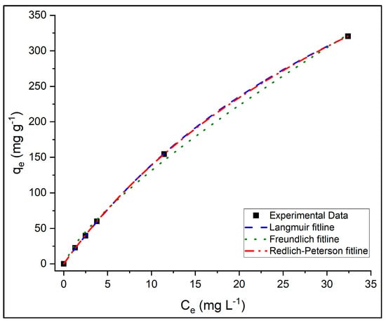 The value of RL provides insight into the nature of the adsorption process: adsorption is considered irreversible when RL = 0, favorable when 0 < RL < 1, linear when RL = 1, and unfavorable when RL > 1. In addition to the Langmuir and the Freundlich models, the Redlich–Peterson isotherm is often applied. This empirical three-parameter model integrates characteristics of both Langmuir and Freundlich equations, making it suitable for describing adsorption behavior on either homogeneous or heterogeneous surfaces []. The standard form of the Redlich–Peterson isotherm is given in Equation (10).