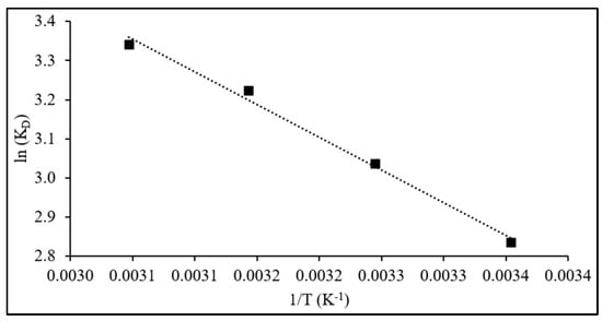 The thermodynamic equilibrium constant (KD) was obtained from a plot of ln(qe/Ce) versus qe, extrapolated to zero []. R denotes the universal gas constant (8.314 J mol−1 K−1), and T is the absolute temperature. Subsequently, values of ΔH0 and ΔS0 were derived from the slope and intercept of the linear plot of ln(KD) against 1/T.