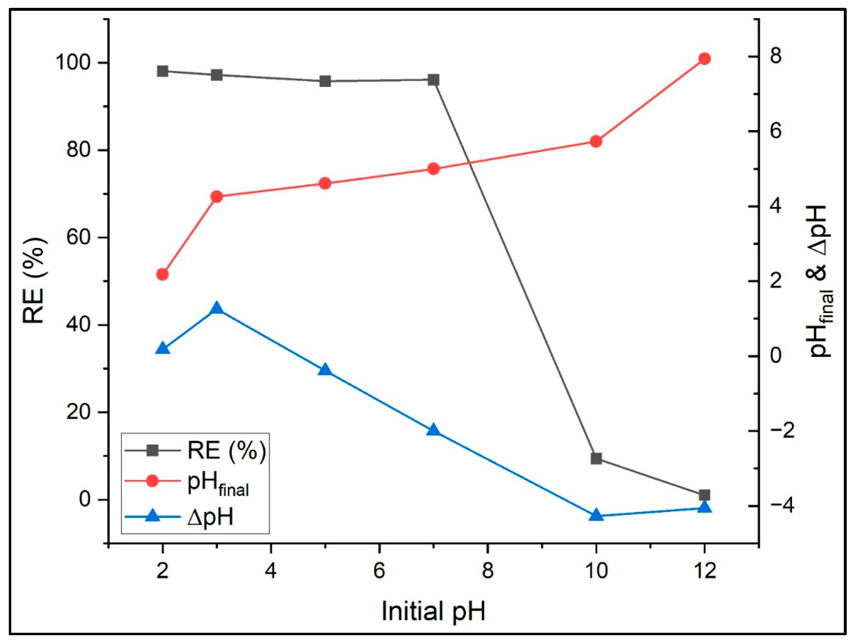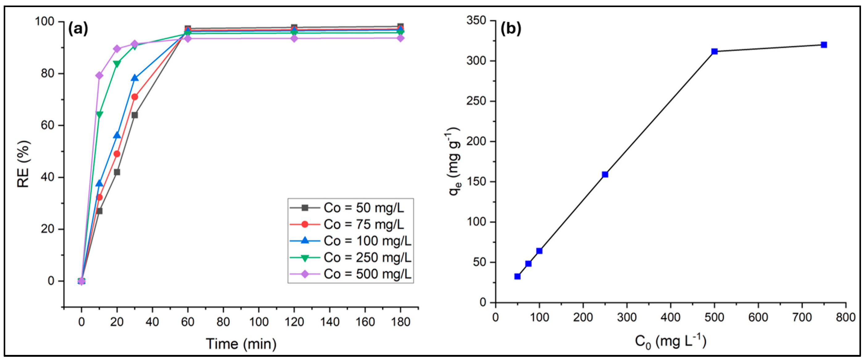 −1) and the percentage removal efficiency (RE, %) at a given contact time were determined using Equations (1) and (2), respectively.