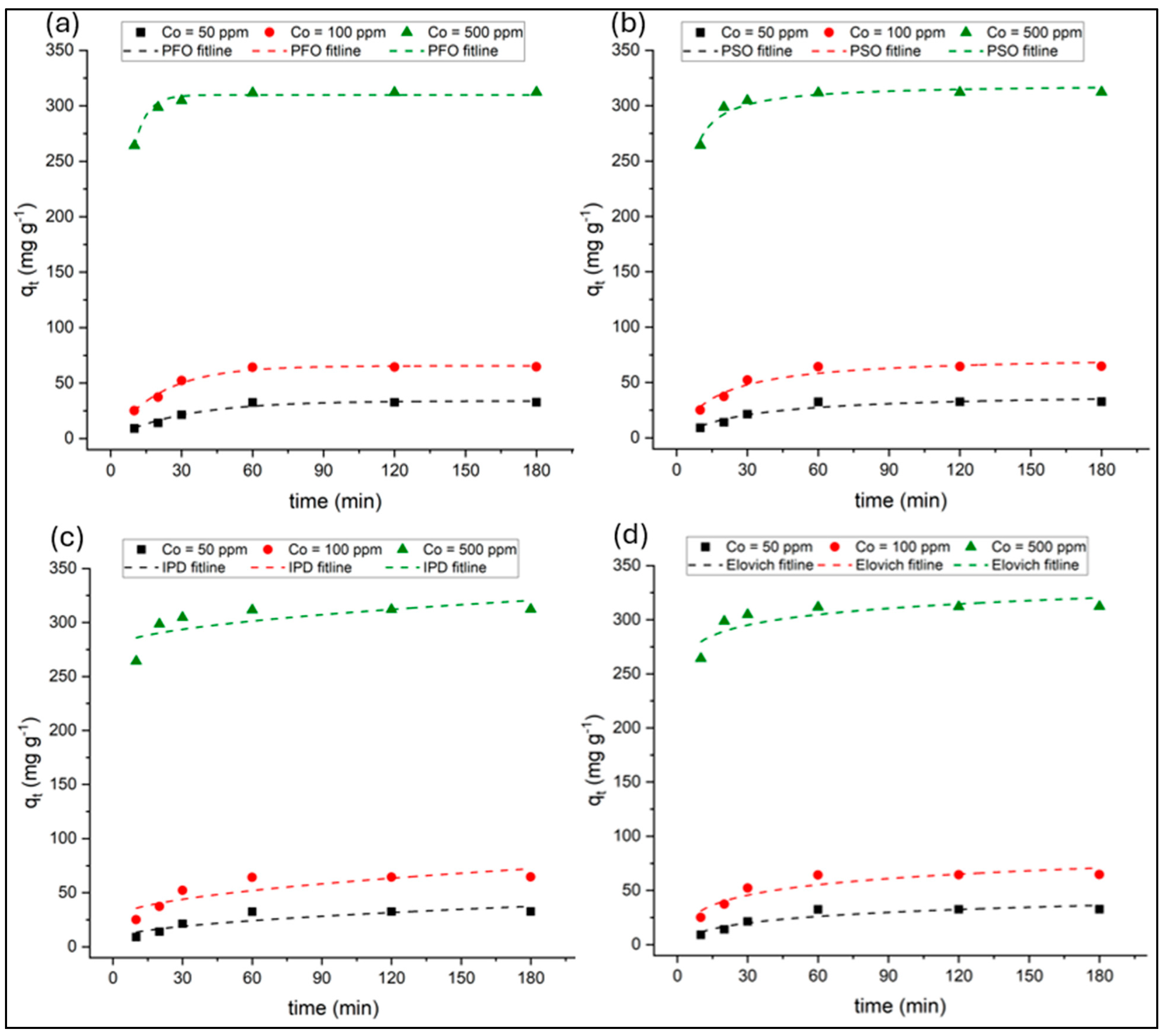 −1) over contact times ranging from 10 to 180 min at 25 °C. The kinetic parameters and model fit metrics for the pseudo-first-order (PFO), pseudo-second-order (PSO), intraparticle diffusion (IPD), and Elovich models were determined for their respective standard equations and graphical plots, as outlined in