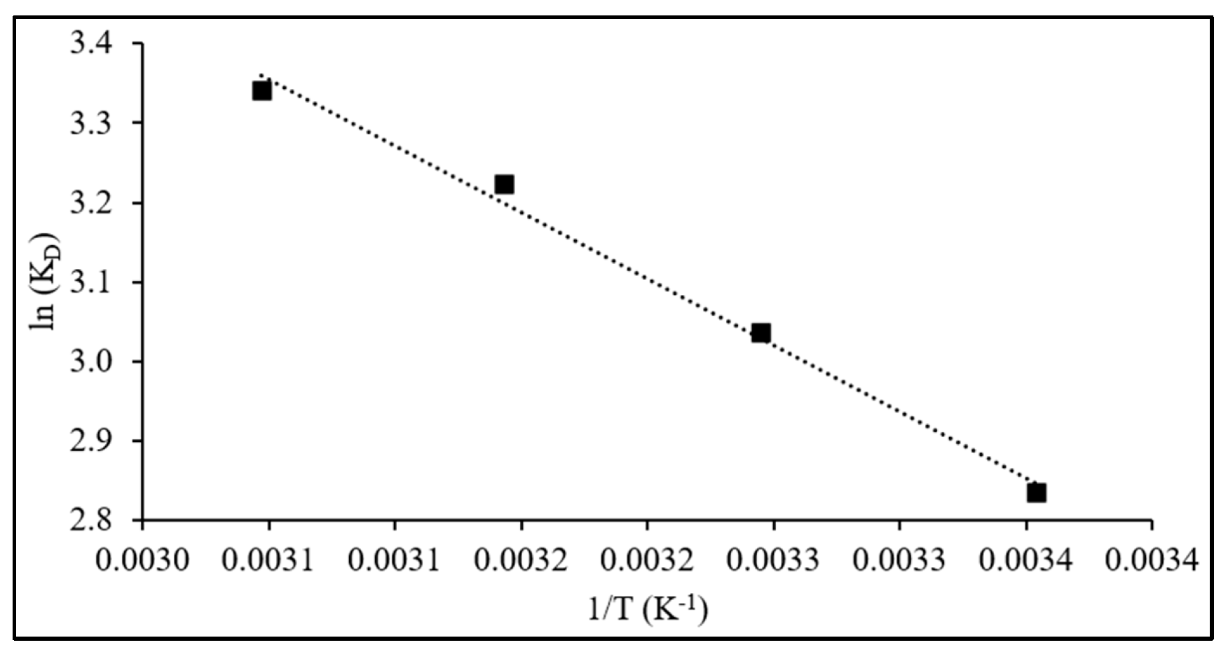 0, were computed by applying Equations (14) and (15) to the adsorption data obtained at temperatures 299, 308, 318, and 328 K, initial dye concentration of 100 mg L