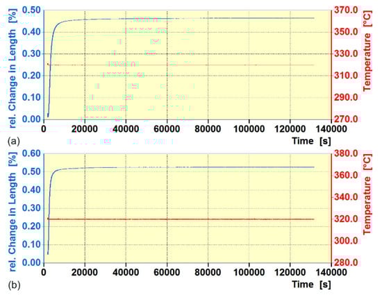 Figure 3 presents the dilatograms for single-step (AT-1, Figure 3a) and double-step (AT-2, Figure 3b) austempered ductile iron samples. The observed increase in sample length at a constant temperature can be attributed primarily to the bainitic phase transformation of supercooled austenite. This occurs because the alloy contains a high concentration of silicon, which suppresses cementite precipitation, as well as significant amounts of molybdenum, copper, and nickel, which collectively widen the so-called process window [,].