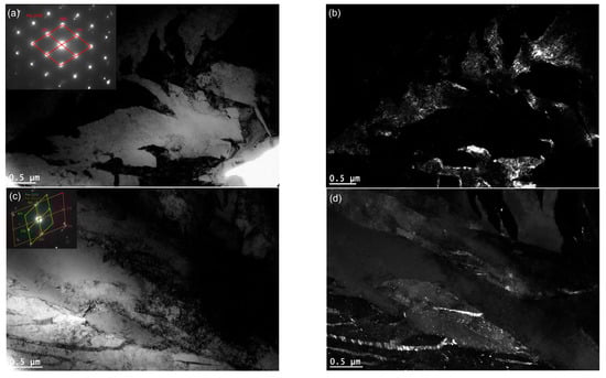 The microstructure of the pearlitic–ferritic ductile iron after conventional austempering: (a,c)—bright-field images, (b,d)—DF images from area (a,c) obtained with the use of austenite reflection.