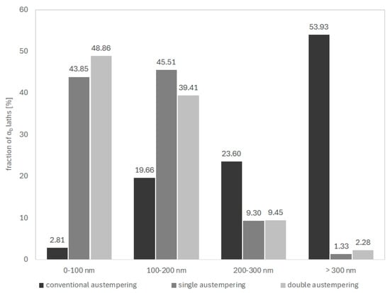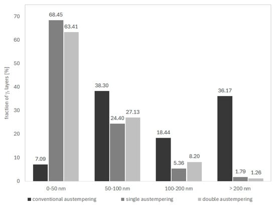 TEM confirmed the feathered, coarse ausferritic structure after conventional austempering (Figure 7). The average ferrite plate thickness was 351 nm, and the average austenite layer thickness was 225 nm (Table 3); however, very large ferrite grains (>300 nm) and thick austenite layers (>200 nm) dominant. In contrast, both AT-1 and AT-2 microstructures consisted of nanoausferrite—bainitic ferrite plates with nanometric thickness, separated by very thin retained-austenite layers (Figure 8 and Figure 9). AT-2 samples had a greater fraction (~5%) of ferrite plates thinner than 100 nm (Figure 10) and fewer very thin (<50 nm) retained-austenite layers (Figure 11) compared to AT-1. Blocky austenite content in AT-2 was also about 5% lower. The greater homogeneity of the AT-2 microstructure is attributed to the pre-heat treatment, involving high-temperature, long-term austenitization before austempering—an innovative approach compared to cyclic martensitic quenching. Previous studies on steels and cast irons have shown that cyclic martensitic quenching refines austenite grains during subsequent austenitization, with the greatest effect after the first cycle [,,]. To avoid the thermal stresses associated with martensite, this study replaces continuous quenching with austempering preceded by long-term, high-temperature austenitization—an entirely novel approach. High austenitization temperature yields large, homogeneous prior-austenite grains with increased carbon concentration. This results in reduced density of ferrite nucleation sites, long ferrite plates, as well as coarser austenite layers and blocks [,]. Moreover, the increased carbon content strengthens the austenite which in turn limits the thickening of ferrite plates during austempering. This can leave a significant fraction of untransformed austenite in the microstructure, increasing with higher austenitization temperature and time. The pre-heat treatment used in this work refined the initial microstructure and retained some residual austenite, facilitating easier nucleation during the second cycle and increasing carbon content and homogeneity. Consequently, AT-2 produced a more uniform microstructure with slightly thinner plates and slightly higher retained-austenite content than AT-1.