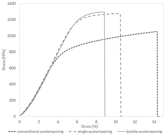 Representative stress–strain curve of the ductile iron after various heat treatments.