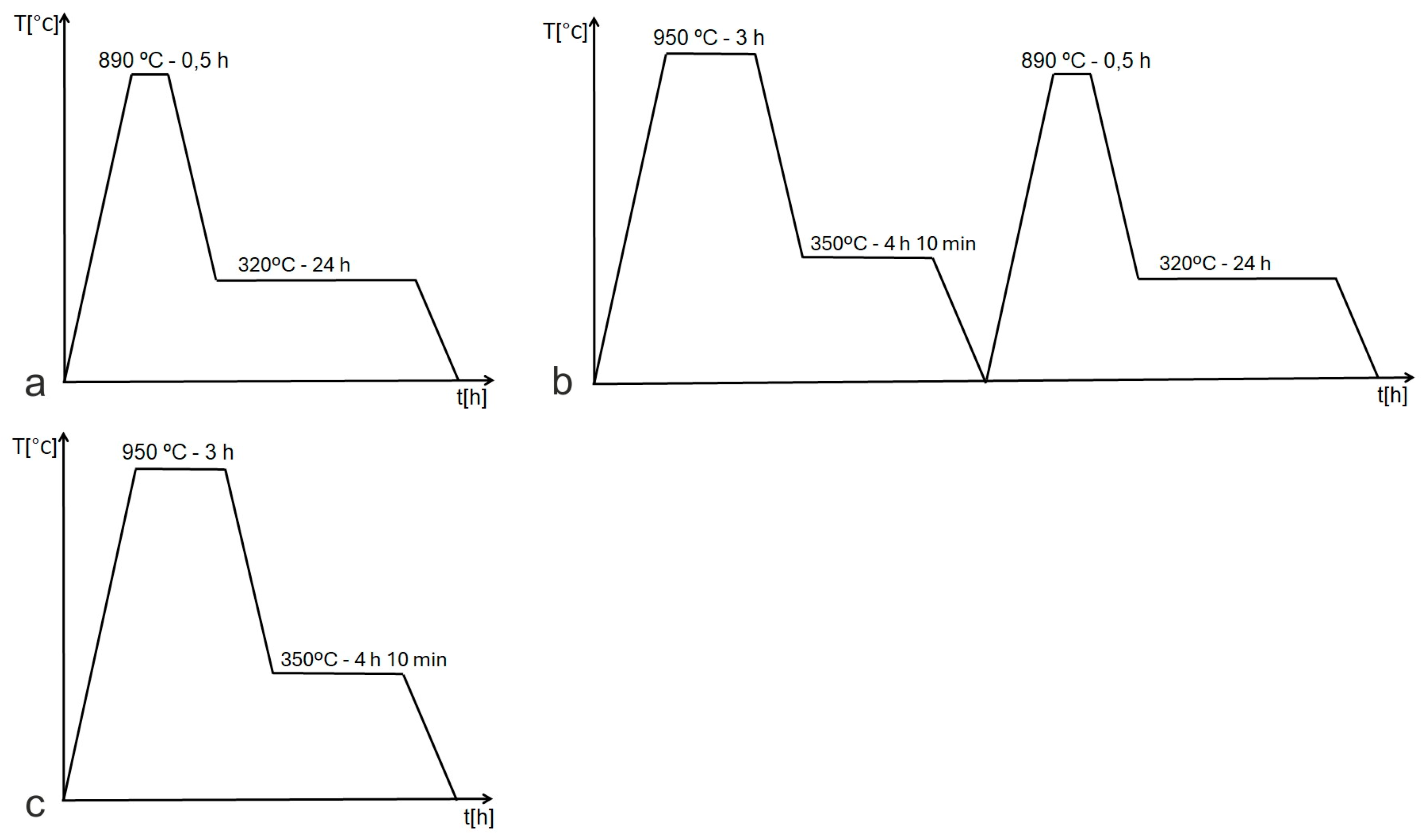 - Both long-term austempering treatments reduced the retained austenite content from approximately 42% to about 22%, increasing hardness from 27 HRC to 32–35 HRC, tensile strength from 1027 MPa to 1220–1296 MPa, and yield strength from 683 MPa to 1033–1054 MPa, while reducing total elongation from 11% to 4.3–4.9% and V-notched impact toughness from 13 J/cm2 to 8–9 J/cm2.