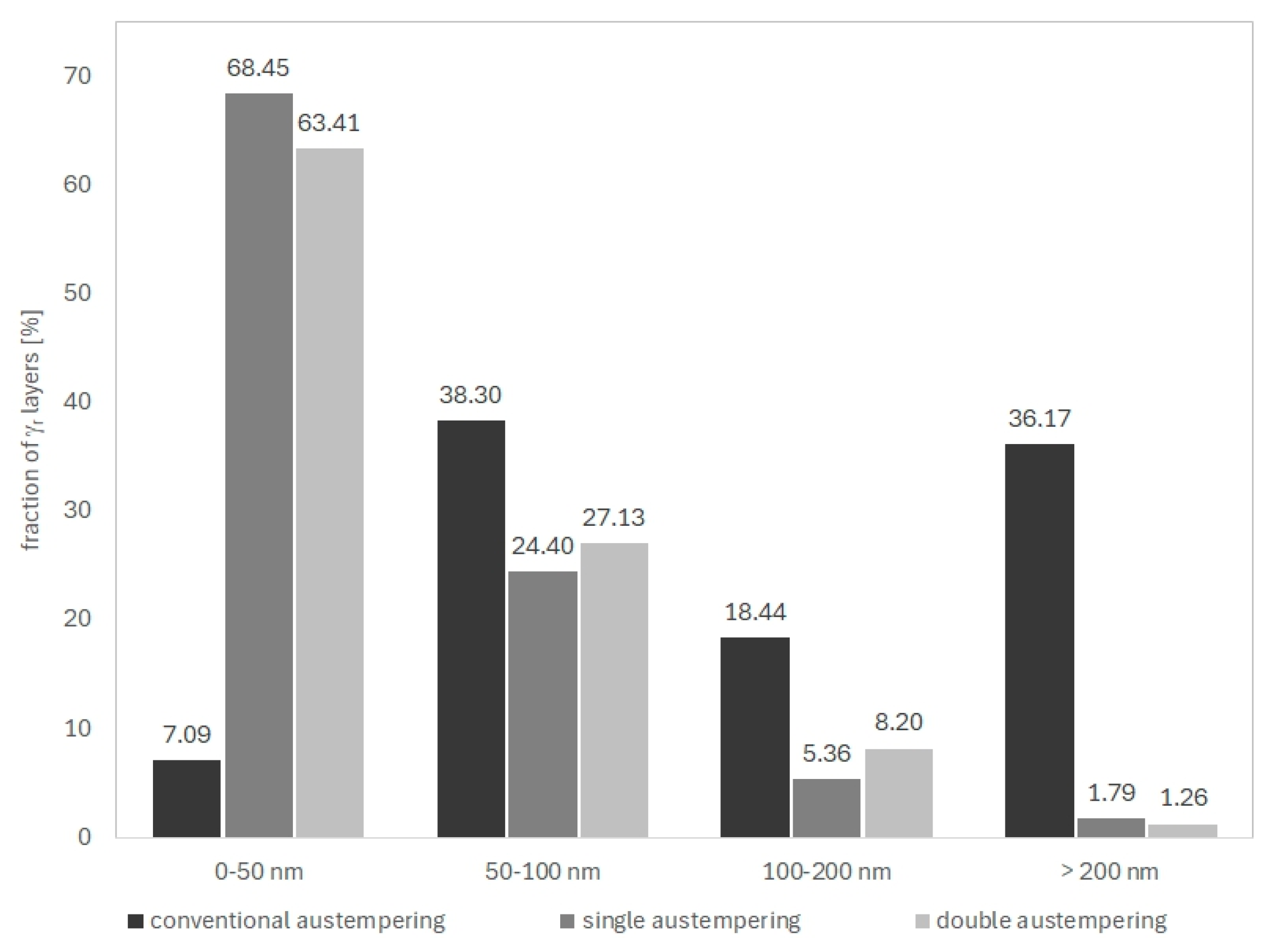 - Long-term austempering carried out at temperatures within the lower range of bainitic transformation resulted in pronounced microstructural refinement compared with conventional austempering. The applied process can be classified as a nanostructurisation heat treatment for ADI.