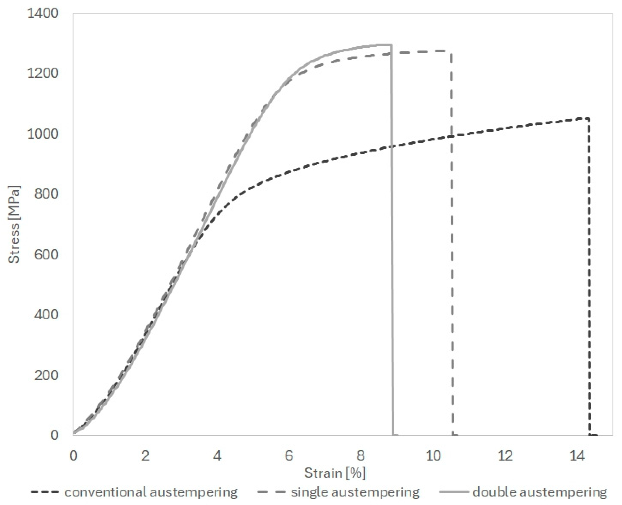 - Long-term austempering is suitable for ADI components requiring high strength and low material costs, provided that they are not subjected to significant dynamic loading. This work demonstrates the effectiveness of controlling the initial microstructure and applying long-term, low-temperature austempering to enhance the mechanical properties of ADI, representing a novel pathway for optimizing its heat treatment.