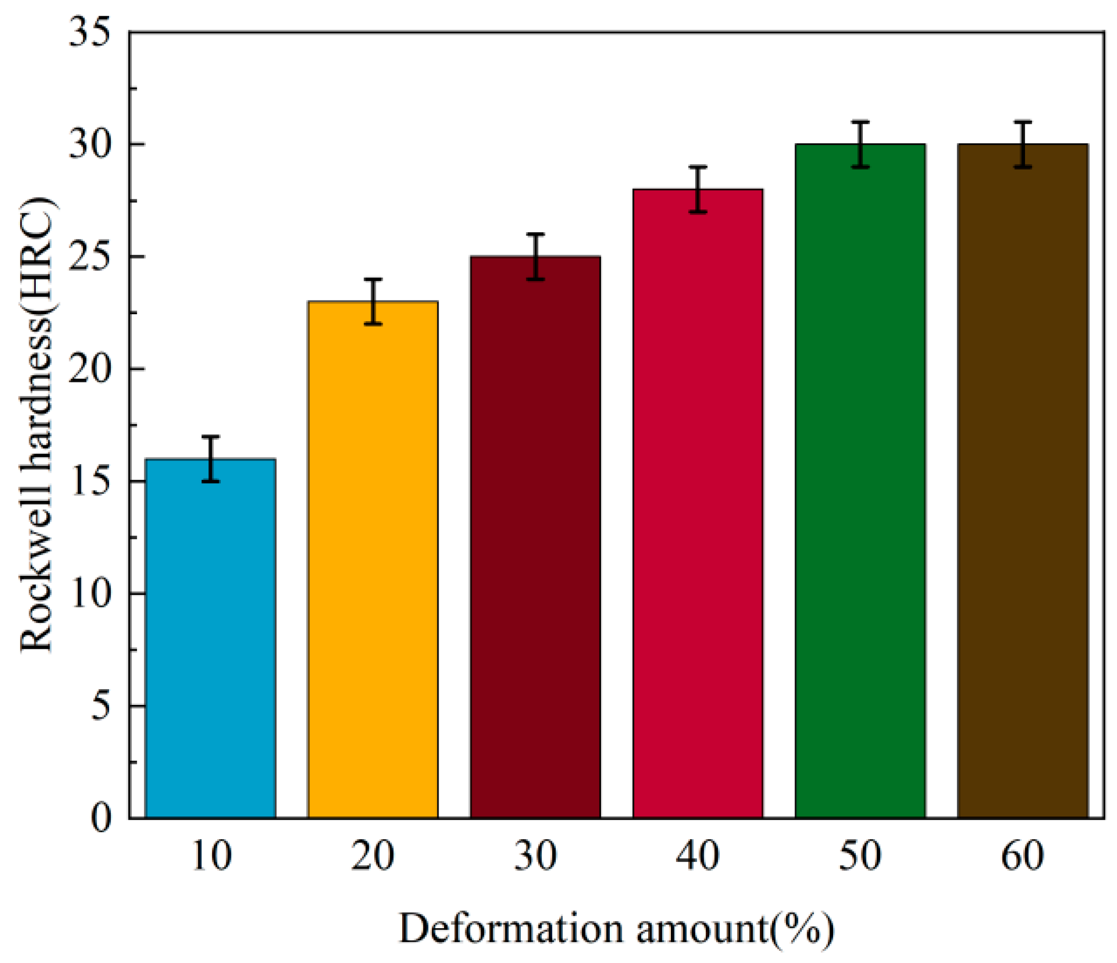 Figure 3 shows the influence of cold-drawing deformation on Rockwell hardness. When the cumulative deformation amount is 10%, the hardness is 16 HRC. As the cumulative deformation amount increases, the hardness increases rapidly; when the cumulative deformation amount reaches 30%, the hardness reaches 25 HRC. Notably, when the cumulative deformation amount exceeds 30%, the effect of hardness improving with the increase in deformation amount is significantly weakened, as indicated by a marked decrease in the upward trend of hardness. Eventually, when the cumulative deformation reaches 50%, the increase in hardness is very small, while when it reaches 60%, the hardness remains unchanged at 30 HRC.
