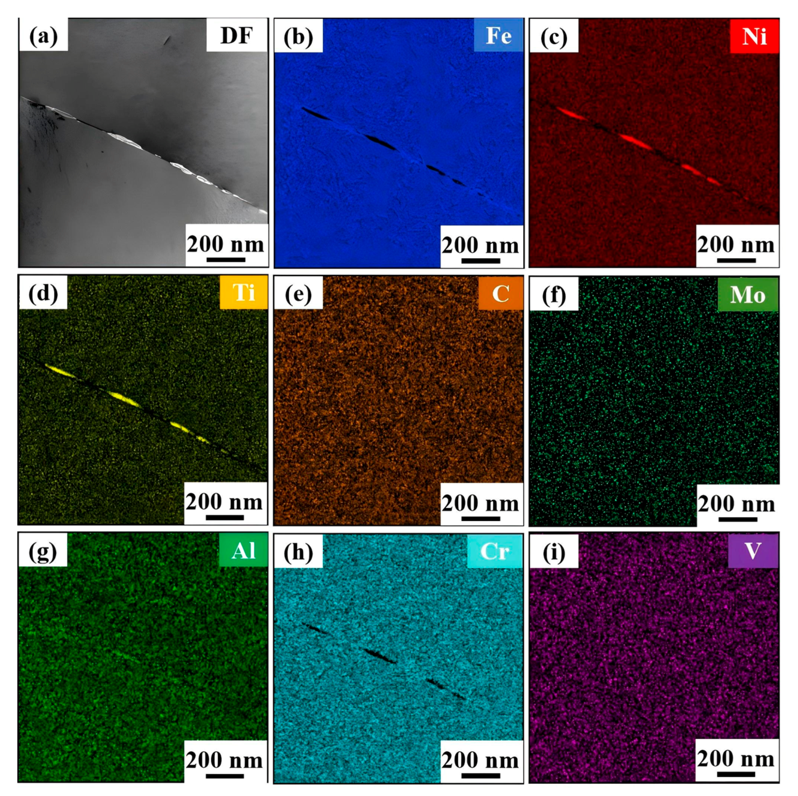 Figure 7. Transmission electron microscopy–energy-dispersive X-ray spectroscopy (TEM-EDS) image of 50% cumulative deformation grain boundary precipitates. (a) DF diagram of precipitates at grain boundaries; (b) Fe; (c) Ni; (d) Ti; (e) C; (f) Mo; (g) Al; (h) Cr; (i) V.