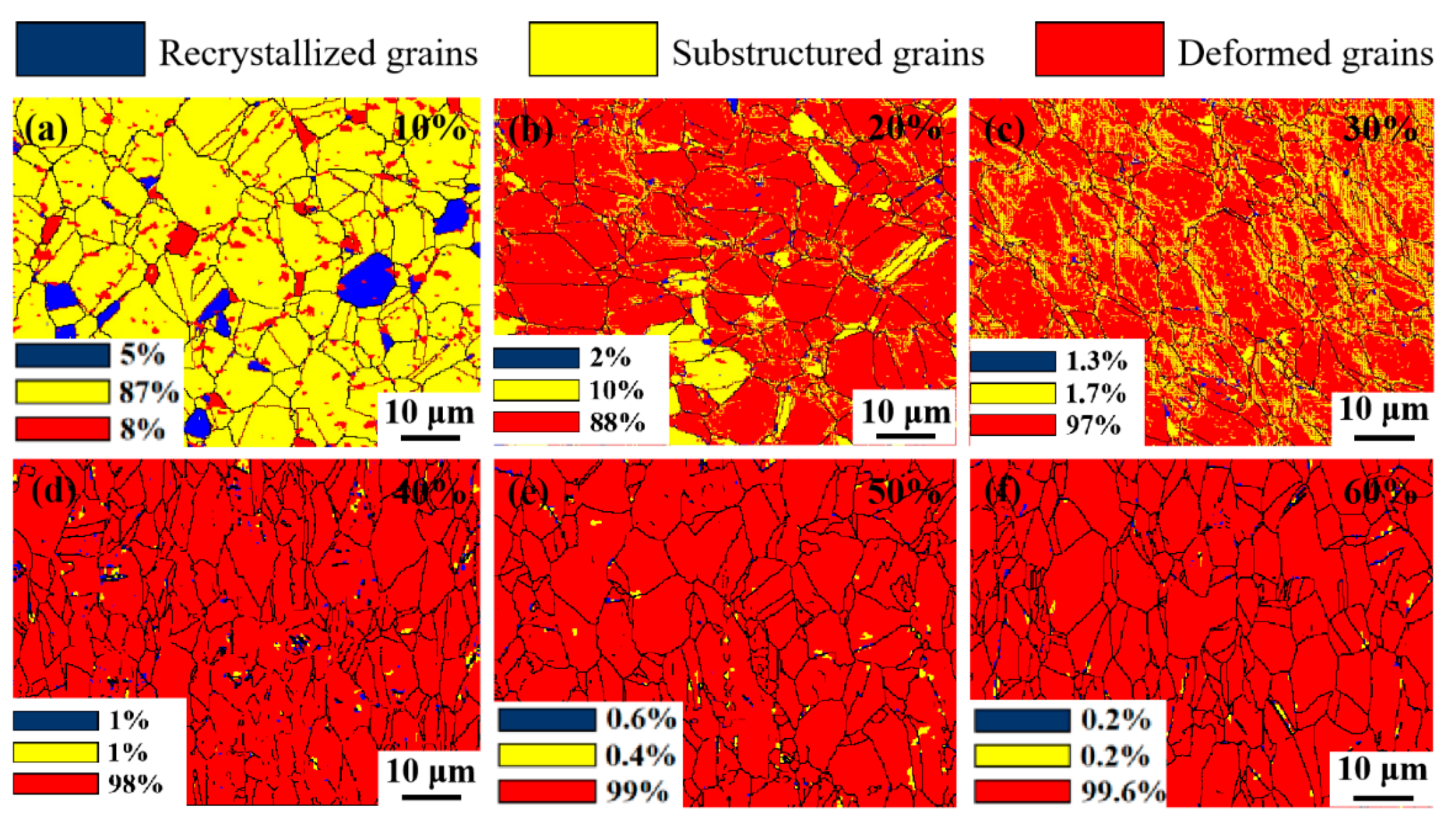 Figure 8 shows the deformation grain evolution of Fe-25Ni-15Cr alloy under different cumulative deformation amounts. The grains were classified based on grain orientation spread (GOS) into three types: recrystallized grains (GOS ≤ 1.5°, blue), substructured grains (1.5° < GOS ≤ 5°, yellow), and deformed grains (GOS > 5°, red). Figure 8a shows the 10% cumulative deformation cold-drawing recrystallization diagram, wherein only 8% of the grains are involved in the deformation, with a large number of substructures. Figure 8b shows the 20% cumulative deformation cold-drawing recrystallization diagram, demonstrating that the volume fraction of deformed grains increases sharply, with approximately 88% of the grains deformed and 10% of the grains not participating in the deformation. When the cumulative deformation amount increases to 30%, as shown in Figure 8c, almost all grains participate in the deformation. With further increases in the cumulative deformation amount, the grains deform more completely; after the deformation amount reaches 60%, the proportion of deformed grains reaches 99.6%, as shown in Figure 8f.