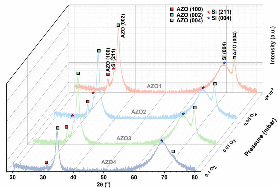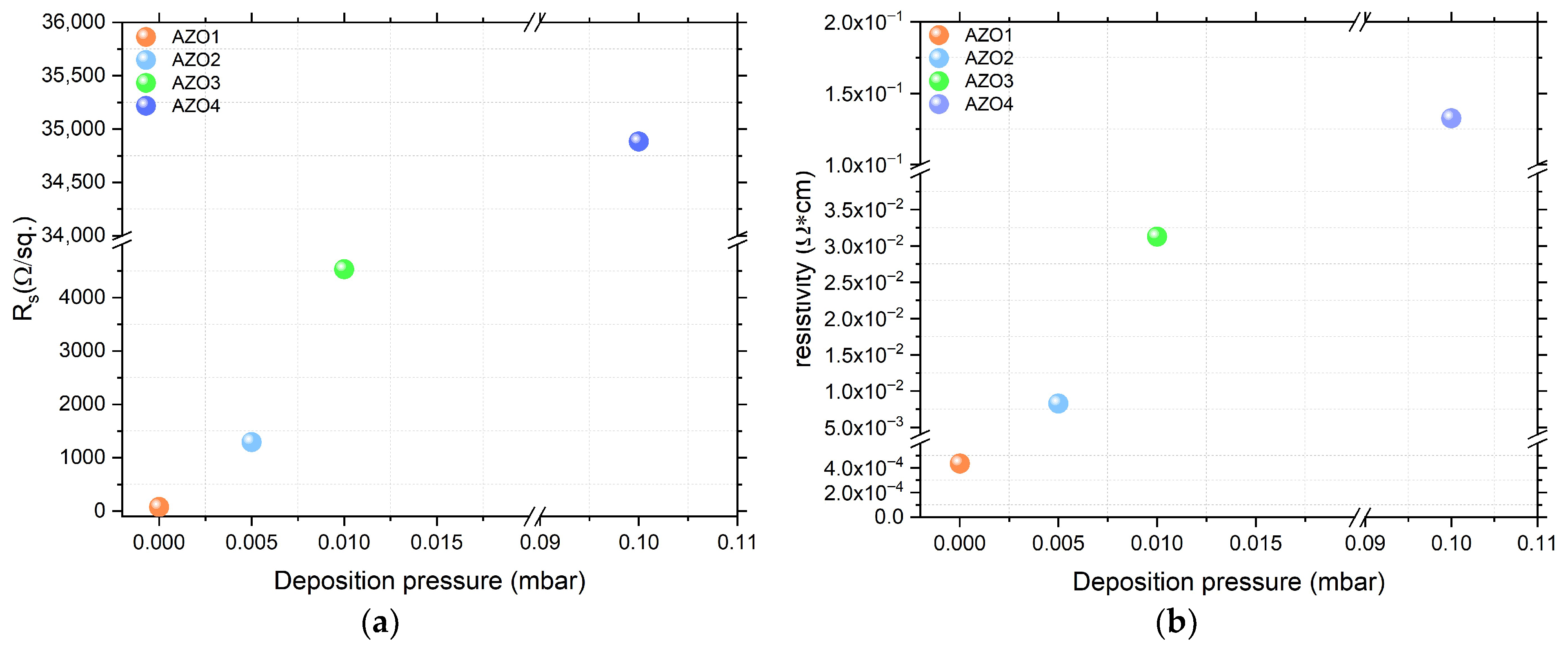 - Kiliszkiewicz, M.; Domaradzki, J.; Posadowski, W.; Mazur, M.; Wiatrowski, A.; Dawidowski, W.; Mazur, P.; Wojcieszak, D.; Chodasewicz, P.; Bartczak, M. Effect of sputtering power and oxygen partial pressure on structural and opto-electronic properties of Al-doped ZnO transparent conducting oxides. Appl. Surf. Sci. 2024, 670, 160601. [Google Scholar] [CrossRef]