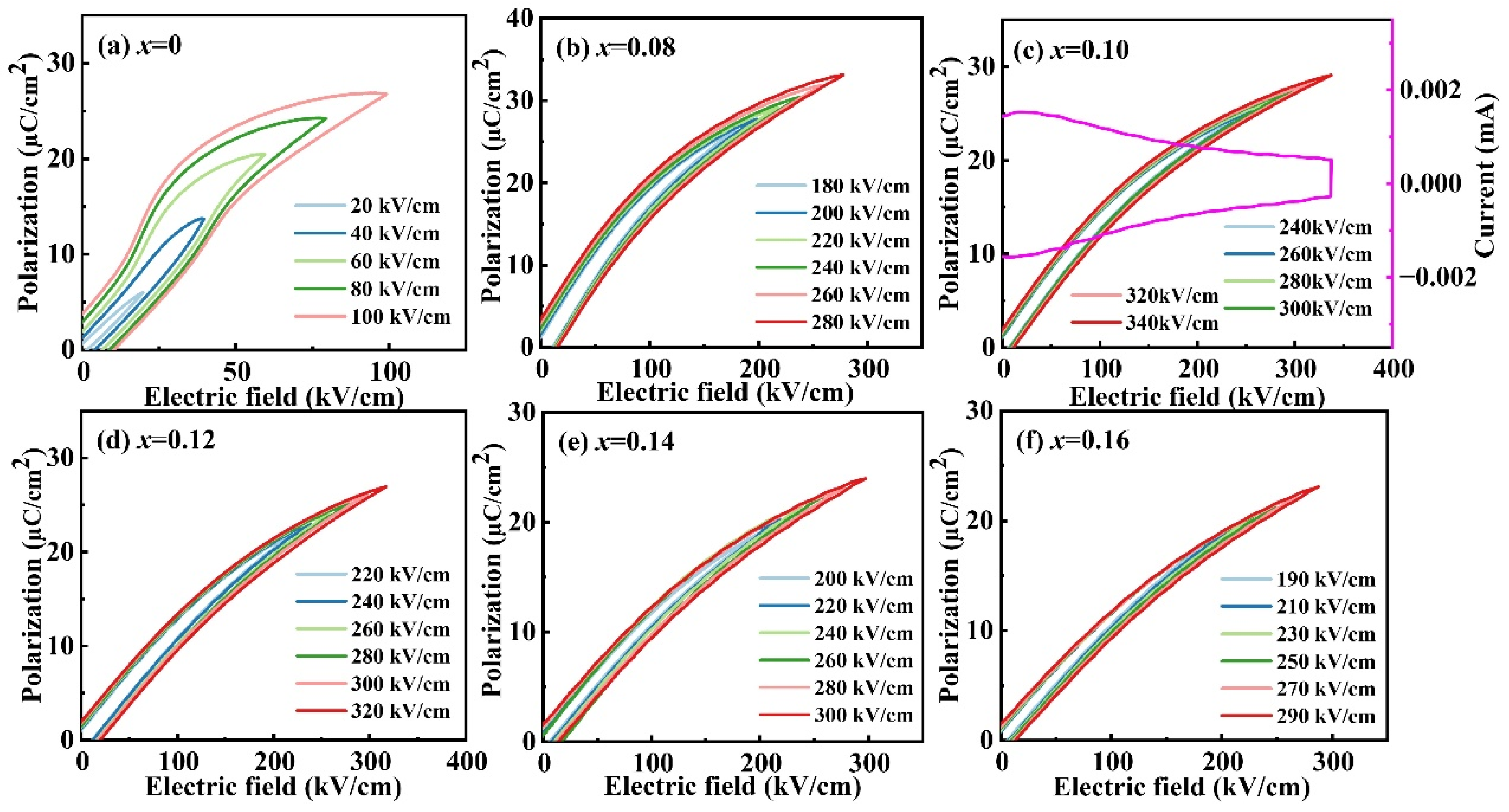 - Zhao, J.; Hu, T.; Fu, Z.; Pan, Z.; Tang, L.; Chen, X.; Li, H.; Hu, J.; Lv, L.; Zhou, Z.; et al. Delayed polarization saturation induced superior energy storage capability of BiFeO3-based ceramics via introduction of non-isovalent ions. Small 2023, 19, 2206840. [Google Scholar] [CrossRef] [PubMed]