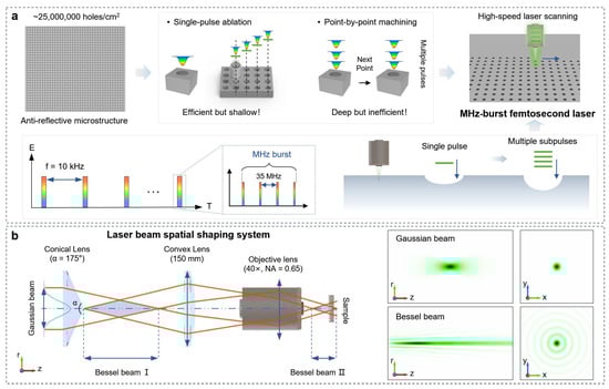 The experimental samples are double-sided polished magnesium fluoride (MgF2) windows, measuring 20 mm × 20 mm, which were securely fixed onto a three-axis motion platform (HS-DX3-V200, Hostechn, Changsha, China) using a custom-made fixture. During the fabrication process, the laser focus was maintained in a fixed position, while the three-axis motion platform facilitated bow-tie scanning of the sample at a speed of 20 mm/s to process the microholes. The laser source used was a high-power ultrafast femtosecond laser (HR-300-1, Ultron Photonics, Hangzhou, China) with an output wavelength of 515 nm, a pulse width of 844 fs, and a repetition rate of 10 kHz. The burst mode of the laser was adjustable to output pulse sequences containing between 1 and 10 sub-pulses (Figure 1a). The beam shaping system utilized an axicon with a cone apex angle of 175°, while the beam focusing system employed a combination of a convex lens (150 mm) and an objective lens (NA = 0.65, 40×) (Figure 1b). The morphology of the microholes was evaluated using a laser scanning confocal microscope (LSCM, LSM700, Carl Zeiss, Oberkochen, Germany) and a field-emission scanning electron microscope (SEM, JSM-7900F, JEOL, Tokyo, Japan). The transmittance of the samples was evaluated using a Fourier transform infrared spectrometer (Nicolet iS50, Thermo Fisher, Waltham, USA). The measurements were conducted in transmission mode with the following parameters: a spectral resolution of 4 cm−1 over the wavenumber range of 4000–400 cm−1, and 32 scans were accumulated and averaged for both the background (open beam) and the sample to ensure a high signal-to-noise ratio. The incident beam spot size on the sample was approximately 10 mm in diameter. The transmittance spectrum was automatically calculated by the instrument’s software (OMNIC, Thermo Scientific, Waltham, USA). The spectral data were then converted from wavenumber (, in cm−1) to wavelength (, in μm) for analysis and plotting using the equation [,]: