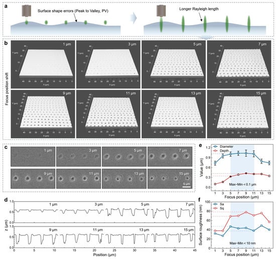 Currently, optical surface shape errors (Peak to Valley, PV) still exist on the window surface even after high-precision polishing []. To achieve high consistency in the manufacturing of microstructures, it is essential to enhance the Rayleigh length of the laser focus (Figure 3a). This is accomplished by transforming the Gaussian beam into a Bessel beam with a longer Rayleigh length []. Despite the focus drift caused by optical surface shape errors, the consistency of the manufactured microstructures remains high. Figure 3b–d illustrate the three-dimensional morphologies, two-dimensional morphologies, and central cross-sectional profiles of microholes at focal positions ranging from 1 μm to 15 μm. Good consistency is observed among the microholes fabricated at the same focal position. However, at focal positions of 13 μm and 15 μm, ablation of the substrate also occurred due to the increased energy of the Bessel side lobes (Figure 3c). Figure 3e depicts how the diameter and depth of the microholes vary with changes in the focal position. The results indicate that both the diameter and depth gradually increase from focal positions of 1 μm to 9 μm, and then decrease thereafter. Notably, the difference in diameter and depth of the microholes in the focal range of 5 μm to 11 μm remains less than 0.1 μm. Figure 3f shows the relationship between surface roughness (Sa and Sq) and the focal position, where the variation trend closely follows that of the microhole structural parameters. Within the focal range of 5–11 μm, the Sa and Sq values averaged 43 ± 3.2 nm and 72 ± 3.5 nm, respectively, demonstrating good stability. This suggests that by selecting an appropriate focal position, high-consistency microholes can still be fabricated, even in the presence of surface shape errors.
