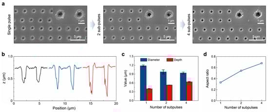 (a) SEM images of microholes fabricated with 1, 2, and 4 sub-pulses; (b) Central cross-sectional profiles of microholes fabricated with 1, 2, and 4 sub-pulses; (c,d) Diameter, depth, and aspect ratio of microholes fabricated with 1, 2, and 4 sub-pulses.