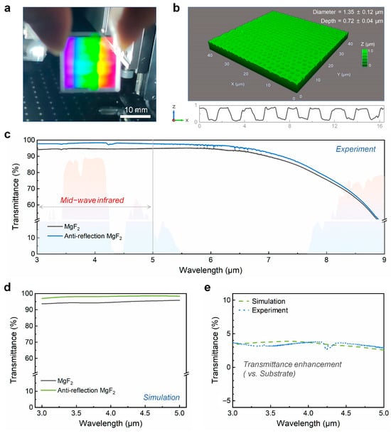 (a) Fabricated anti-reflective MgF2 window; (b) LSCM image of the microholes on the surface of the anti-reflective MgF2 window; (c) Measured transmittance of the anti-reflective MgF2 window (the colored background represents the atmospheric window); (d,e) Simulated transmittance in the core working band (3–5 μm) of the MgF2 window and comparison with experimental testing results.