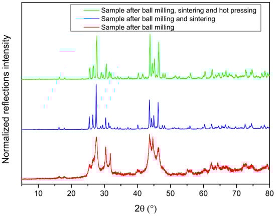 Uniaxial hot press sintering was performed on the polycrystalline powders at 673 K and 80 MPa for 1 h under Ar atmosphere in a HP20, Thermal Technologies system. The thermal diffusivity (D) of the sample was measured by a Netzsch LFA 457 laser setup (Selb, Germany). Data were collected in 25 K increments on pellet coated with graphite over the temperature range 300–473 K. The determination of specific heat capacity (Cp) was performed based on the comparative method using a pyroceram sample as reference. The thermal conductivity was determined by using the formula: