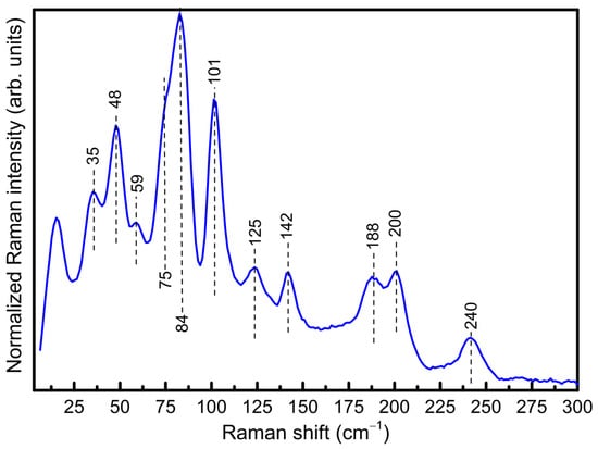 The room temperature Raman spectrum of Sn38Sb8I8 is shown in Figure 3. Similarly to previous studies [,], the low-energy peaks, characteristic of clathrate structures with restricted guest motions (known as “rattling modes”) are observed at ca. 35 cm−1. This is closely related to the large thermal displacement values determined for the iodine atoms via Rietveld refinement, as mentioned above. At higher frequencies, the peaks are attributed to the framework vibrations. In particular, the presence of Sb atoms leads to many distinct vibrational modes around 100–150 cm−1 due to its different mass and chemical bonding compared to Sn.