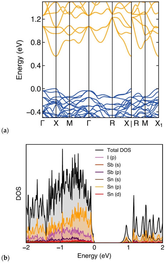 The calculated electron band structure and the corresponding total and projected electronic density of states (DOS) of Sn38Sb8I8 are shown in Figure 5, where the Fermi level is set at 0 eV. The band structure indicates that the system exhibits a semiconducting behavior, with a direct energy band gap at the X-point in the Brillouin k-space. DOS calculations show a band gap of 0.71 eV for Sb8Sn38I8. This result is close to the experimental value of 0.737 eV but significantly larger than 0.24 eV reported by Eto et al. [], likely reflecting improved structural relaxation and basis set convergence compared with less modern calculations. The projected DOS (Figure 5b) shows that the valence band is primarily composed of Sn(p) and I(p) states, with smaller contributions from Sb(p), while the conduction band is dominated by Sn s and p orbitals. The pronounced iodine p-character near the valence-band edge confirms strong guest–host hybridization, which produces the sharp DOS features also reported in []. This hybridization gives rise to mixed ionic–covalent bonding between the Sn/Sb framework and the iodine guests, stabilizing the structure and accords with the Zintl–Klemm concept.