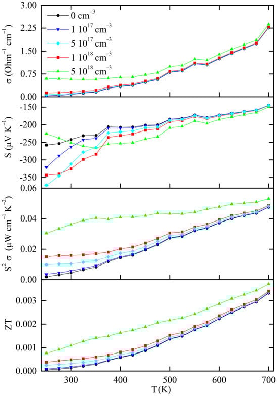 The calculated Seebeck coefficients are negative throughout the investigated range, confirming the n-type character of charge transport. At 300 K, |S| varies from approximately −360 µV K−1 at low electron concentrations (~5 × 1017 cm−3) to −200 µV K−1 at higher concentrations (~5 × 1018 cm−3). As temperature increases, |S| gradually decreases for highly doped cases but remains nearly constant or slightly increases for the lower carrier concentrations, indicating a crossover from degenerate to non-degenerate behavior at elevated temperatures.