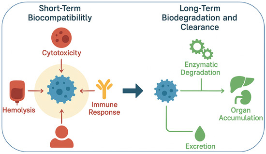 Biocompatibility and biodegradability are two of the most crucial parameters that determine the clinical success of smart nanomaterials in pharmaceutics. While stimuli-responsive and multifunctional properties offer therapeutic advantages, their safety profile dictates whether they can be translated from laboratory models into approved medical applications. In particular, nanomaterials interact intimately with biological systems blood, cells, tissues, and organs, making it essential to evaluate their compatibility and degradation behavior in vivo [48]. Biocompatibility and biodegradability represent two distinct but interrelated aspects of nanomaterial safety. Short-term biocompatibility focuses on the immediate physiological interactions of nanomaterials, including their cytotoxicity toward mammalian cells, hemolytic potential in blood, and the degree of inflammatory or immune activation following administration. These responses are usually assessed through in vitro cell viability assays, hemocompatibility tests, and cytokine analysis in animal models. In contrast, long-term biodegradability refers to the breakdown, clearance, and accumulation behavior of nanomaterials over extended periods. Biodegradable polymers such as PLGA and PCL degrade into metabolizable byproducts, while inorganic nanomaterials often show slower clearance. For example, although ultrasmall gold nanoparticles (<5 nm) can undergo renal excretion, most therapeutic gold nanoparticles typically exceed this size and are retained within the reticuloendothelial system, especially in the liver and spleen. Such accumulation underscores potential long-term safety concerns, including oxidative stress or chronic inflammation. Therefore, designing nanomaterials with controlled degradation profiles and predictable clearance pathways remains essential to achieving both short-term safety and long-term biocompatibility.