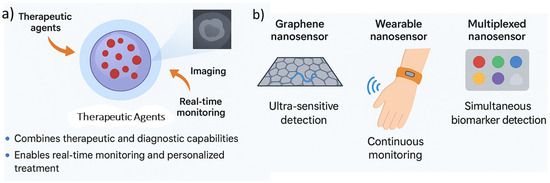Illustration of theranostic nanoplatforms, (a) integrating therapeutic agents with imaging modalities for real-time monitoring, and emerging nanosensor technologies, (b) including graphene-based, wearable, and multiplexed systems for ultra-sensitive and continuous disease biomarker detection.