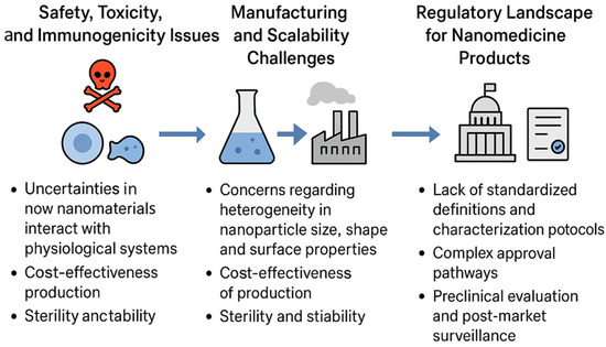 The clinical translation of nanomaterials for therapeutic applications has been largely limited by concerns regarding safety, toxicity, and immunogenicity. Despite the promising efficacy of nanomedicine demonstrated in preclinical studies, several uncertainties remain regarding how nanomaterials interact with complex human physiological systems. The unique physicochemical properties of nanomaterials, such as their size, shape, surface chemistry, and charge, can impart both therapeutic benefits and toxicological risks, making a clear evaluation essential for clinical use [11,157]. A primary challenge lies in the biodistribution and clearance of nanomaterials. Nanoparticles smaller than 10 nm are rapidly eliminated through renal filtration, while those larger than 200 nm tend to accumulate in the liver and spleen due to reticuloendothelial system (RES) uptake. While such organ accumulation can enhance local therapy in specific cases, it often leads to concerns of off-target toxicity and long-term retention. For example, gold nanoparticles (AuNPs) and carbon-based nanomaterials have been reported to persist in organs for extended durations, raising potential risks of chronic toxicity [158]. Another critical issue is oxidative stress and inflammation triggered by reactive oxygen species (ROS) generated upon nanoparticle cell interactions. Transition metal oxides such as ZnO or TiO2 can cause mitochondrial damage and DNA fragmentation through ROS overproduction [159]. Similarly, cationic surface charges, while beneficial for enhancing cellular uptake, often disrupt cell membranes and increase cytotoxicity. Consequently, surface modification strategies such as PEGylation, zwitterionic coatings, or biomimetic cloaking are widely used to mitigate toxicity and reduce immune recognition [160]. Immunogenicity is a significant barrier in clinical translation. Nanomaterials may activate the complement system, leading to complement activation-related pseudoallergy (CARPA). This hypersensitivity reaction has been reported for liposomal formulations such as Doxil®, requiring careful preclinical immunological testing [161]. Additionally, nanoparticle-induced cytokine storms pose serious risks in systemic administration, particularly in immunocompromised patients. Personalized immunotoxicity assessments are therefore critical to predict patient-specific risks [162]. Long-term toxicity remains poorly understood due to the lack of standardized chronic exposure studies. Most toxicity assessments focus on short-term cytotoxicity in vitro or acute animal models, which fail to capture long-term effects such as carcinogenicity, reproductive toxicity, or transgenerational risks [163]. Emerging evidence suggests that nanomaterials may interfere with genetic regulation, epigenetic modifications, and stem cell differentiation, which could have implications for developmental biology and fertility [164]. Thus, addressing safety and immunogenicity concerns requires integrated approaches: (1) developing standardized testing protocols, (2) designing biodegradable and stimuli-responsive nanomaterials, and (3) utilizing advanced in vitro organ-on-chip and in silico models for predictive toxicology. In conclusion, while nanomaterials hold strong therapeutic promise, systematic toxicity evaluations and immunological profiling remain indispensable for ensuring safe and effective clinical translation.