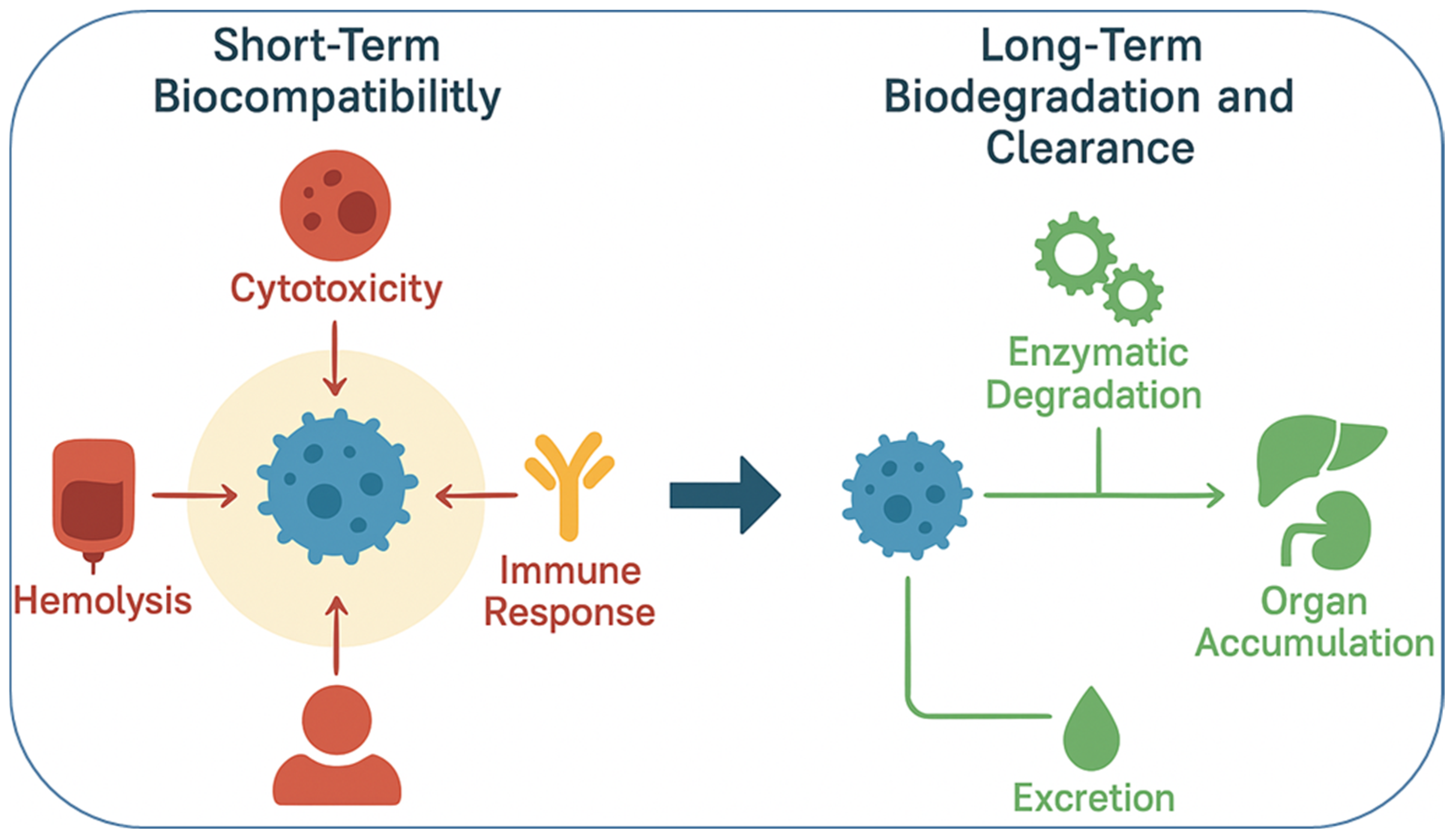 | Hybrid and Composite Nanomaterials | Metal–polymer or silica–lipid composites | Combined hydrolytic, oxidative, and enzymatic degradation depending on components | Mixed clearance through hepatobiliary and renal pathways | Complexity offers multifunctionality but complicates predictability of degradation and regulatory approval | [60,61] |