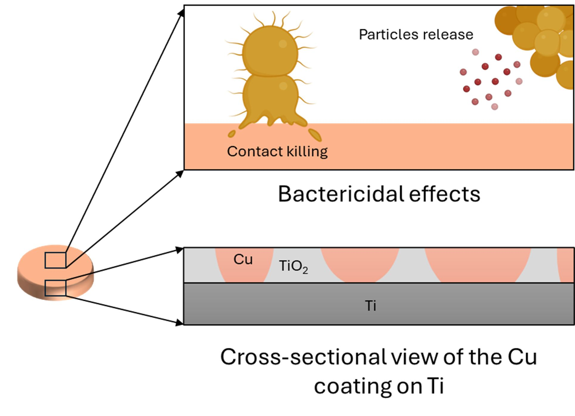 | Cu | Plasma electrolytic oxidation | Ti6Al4V Plates, 5 × 5 × 1 mm | S. aureus CFU count, 2, 4, 6, 8 and 24 h timepoints 5 × 104 CFU/mL dose | Adhered bacteria on samples decreased to undetectable levels after 2 h and further timepoints. Compared to control samples, this corresponded to 3 log10, 4 log10, 5.39 log10 reductions after 4 h, 6 h and 24 h. | Hoene et al., 2013 [65] |