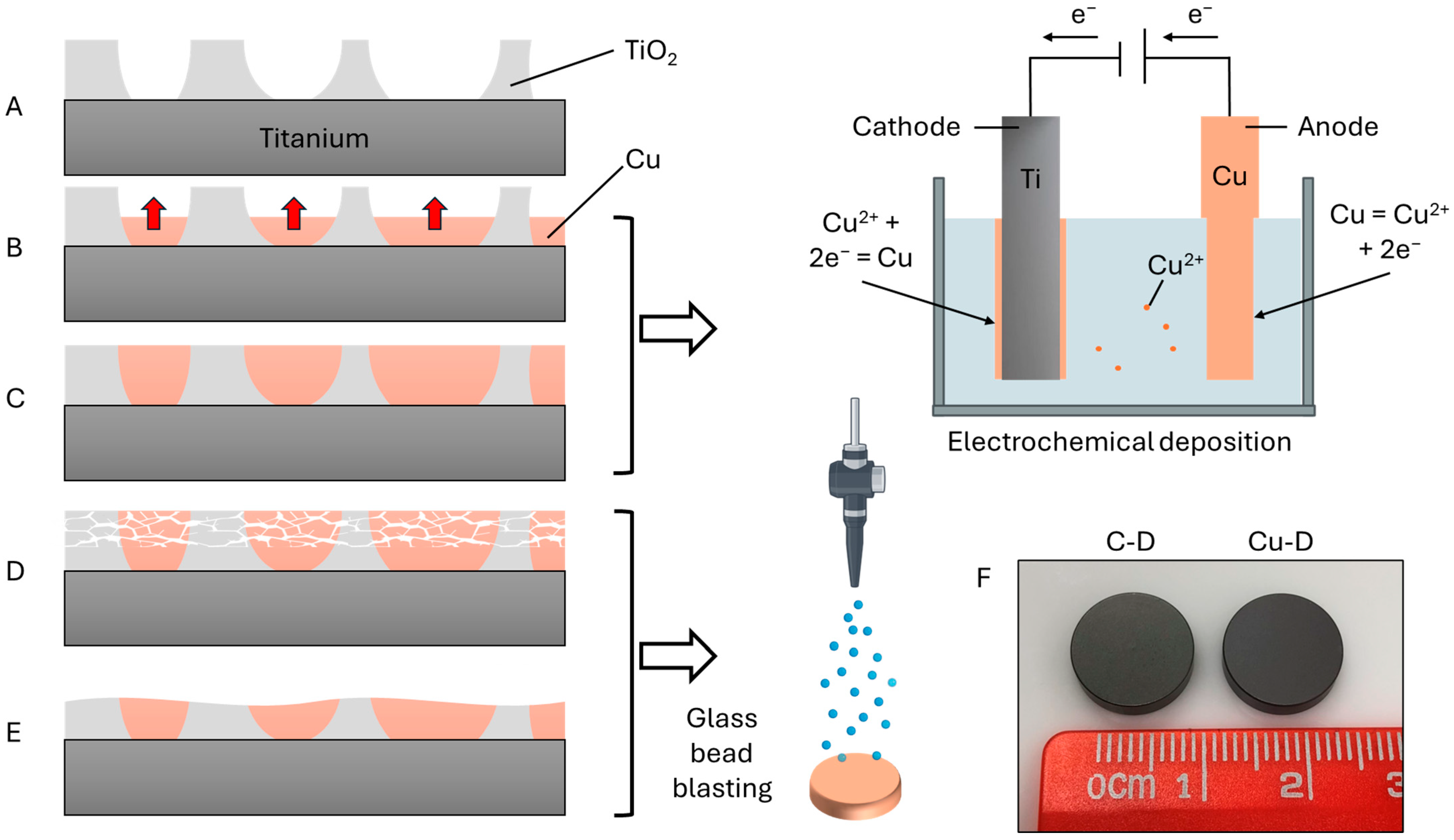 - Giraldo-Osorno, P.M.; Turner, A.B.; Barros, S.M.; Büscher, R.; Guttau, S.; Asa’ad, F.; Trobos, M.; Palmquist, A. Anodized Ti6Al4V-ELI, electroplated with copper is bactericidal against Staphylococcus aureus and enhances macrophage phagocytosis. J. Mater. Sci. Mater. Med. 2025, 36, 14. [Google Scholar] [CrossRef]