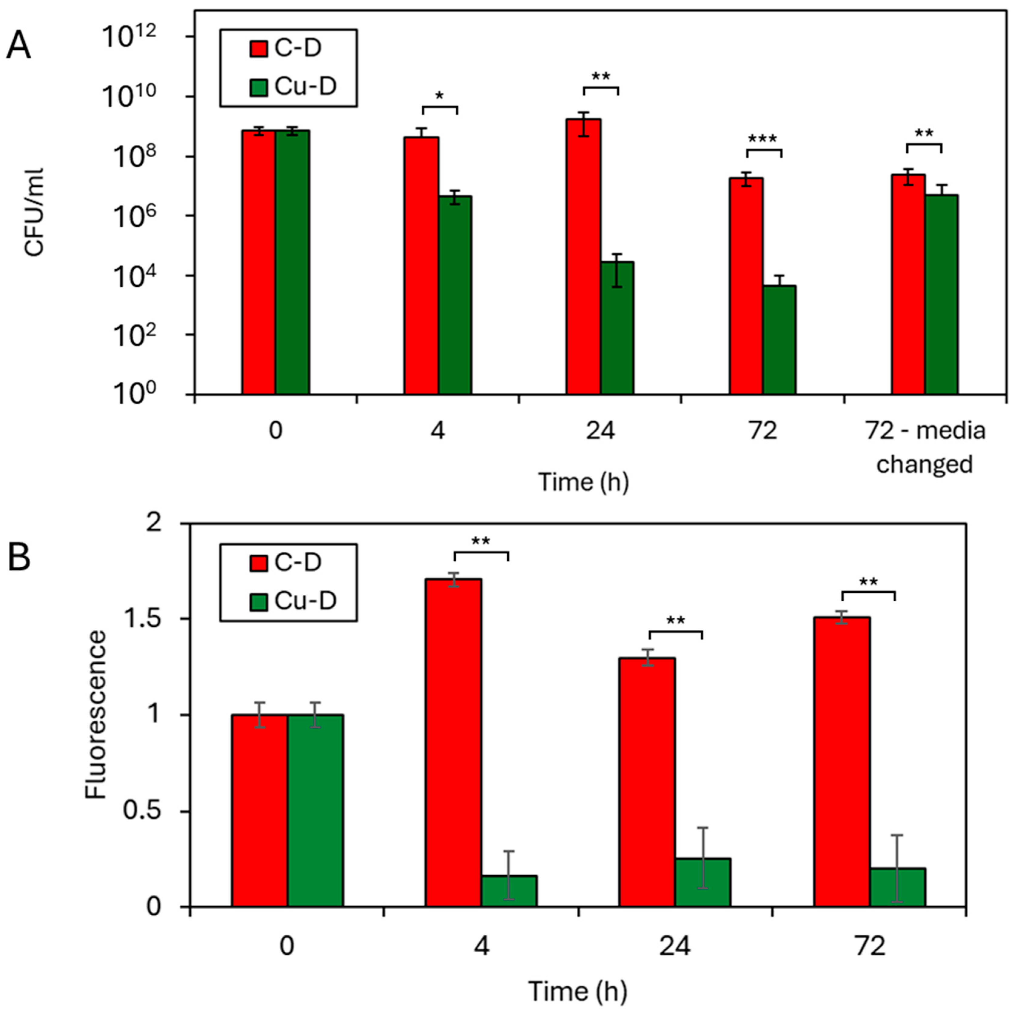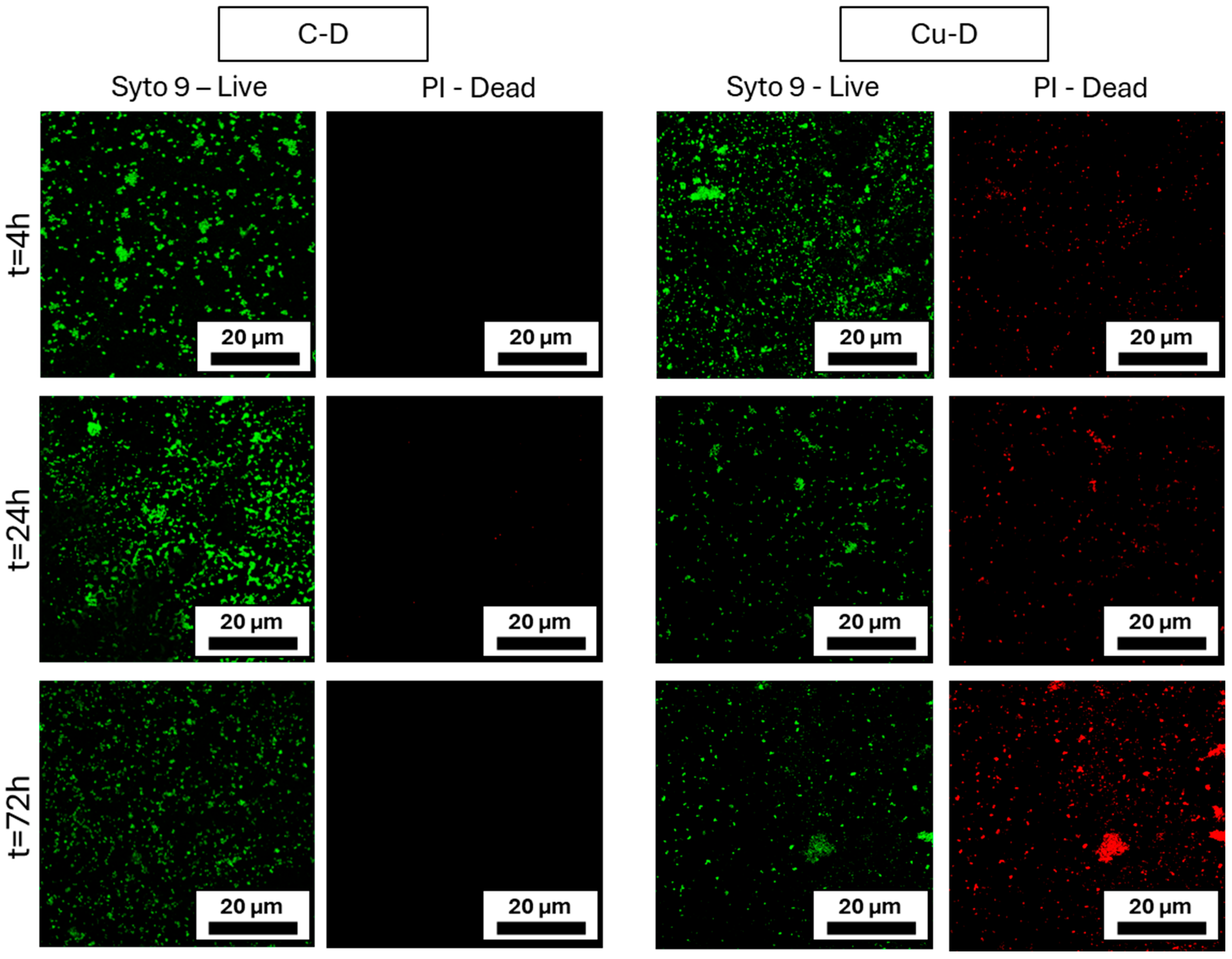 | Experimental | Cu-D sample S. aureus, 1–5 × 108 CFU/mL | 4 h, 24 h, 72 h No media change |