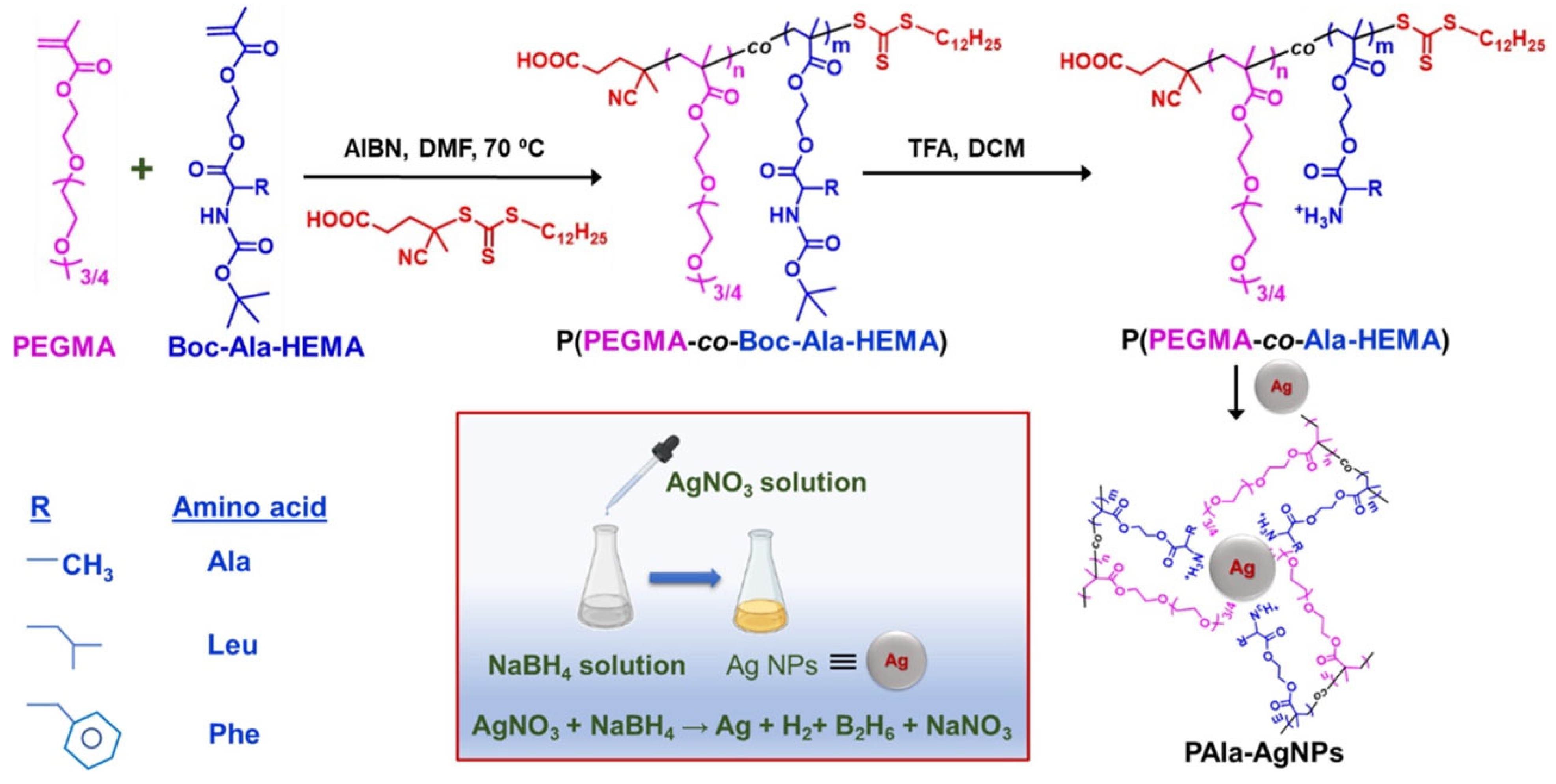 | AgNPs | P(PEGMA-co-R-HEMA) | RAFT | Physisorption | Therapeutics | [112] |