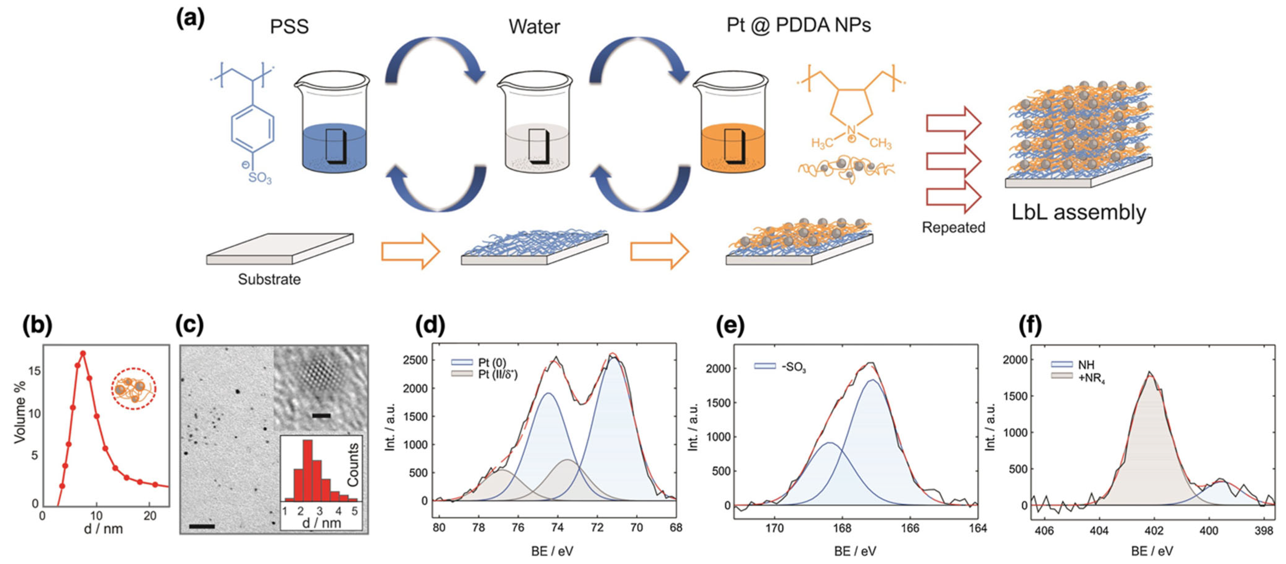 | Energy Conversion | PtNPs | PDDA, PSS | Layer-by-layer | Pt core: ~2.6 nm; PDDA-capped NPs: ~11 nm | Uniform film formation in LbL assemblies | Efficient HER electrocatalysis | [121] |