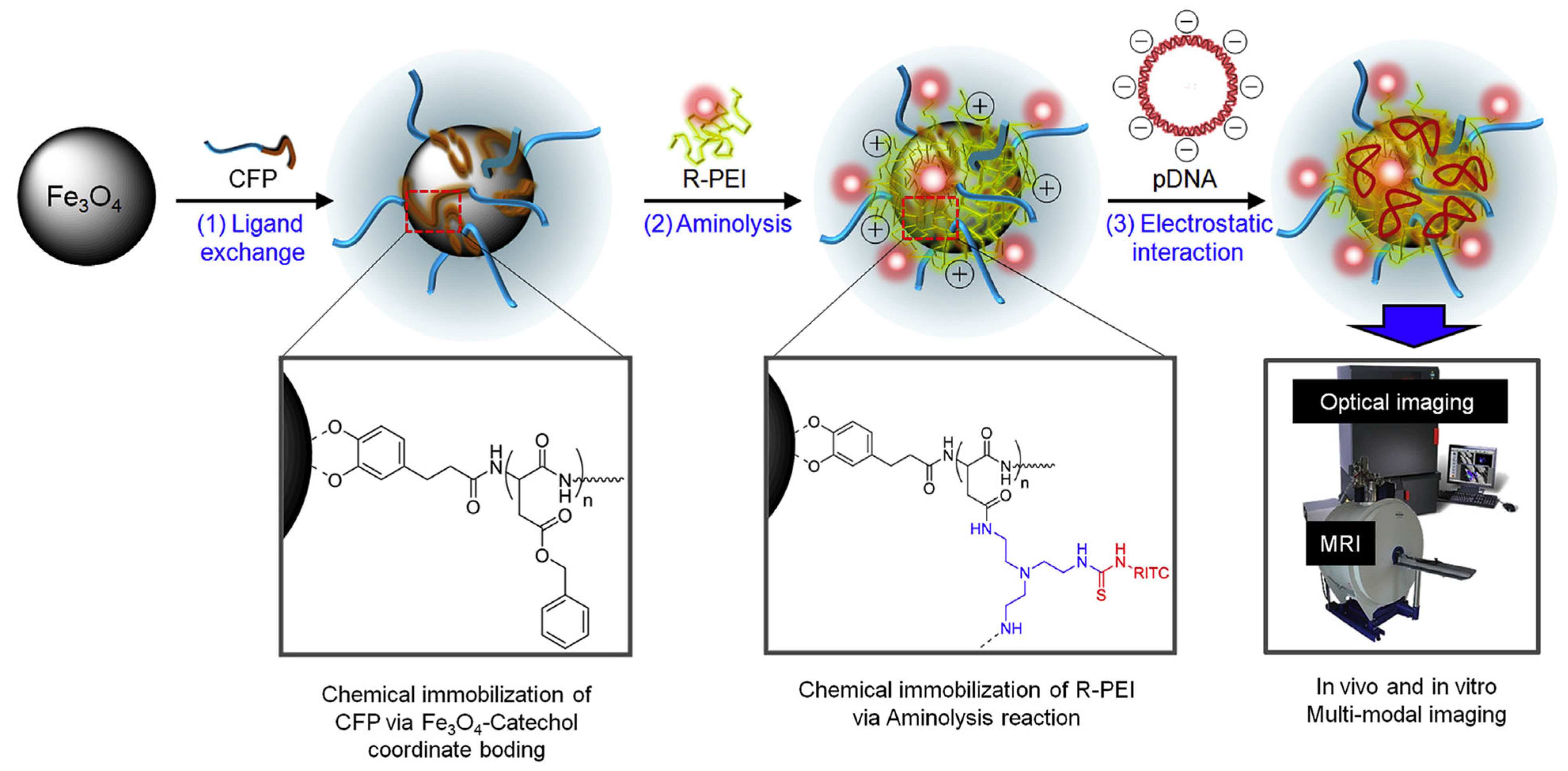 | Gene delivery | Fe3O4 NPs | CFP, R-PEI | Grafting to | Oleic acid-capped Fe3O4 NPs: ~15 nm; with polymer shell: ~40 nm | Stable, positively charged in aqueous media | Efficient gene delivery; MRI and fluorescence cell tracking | [170] |