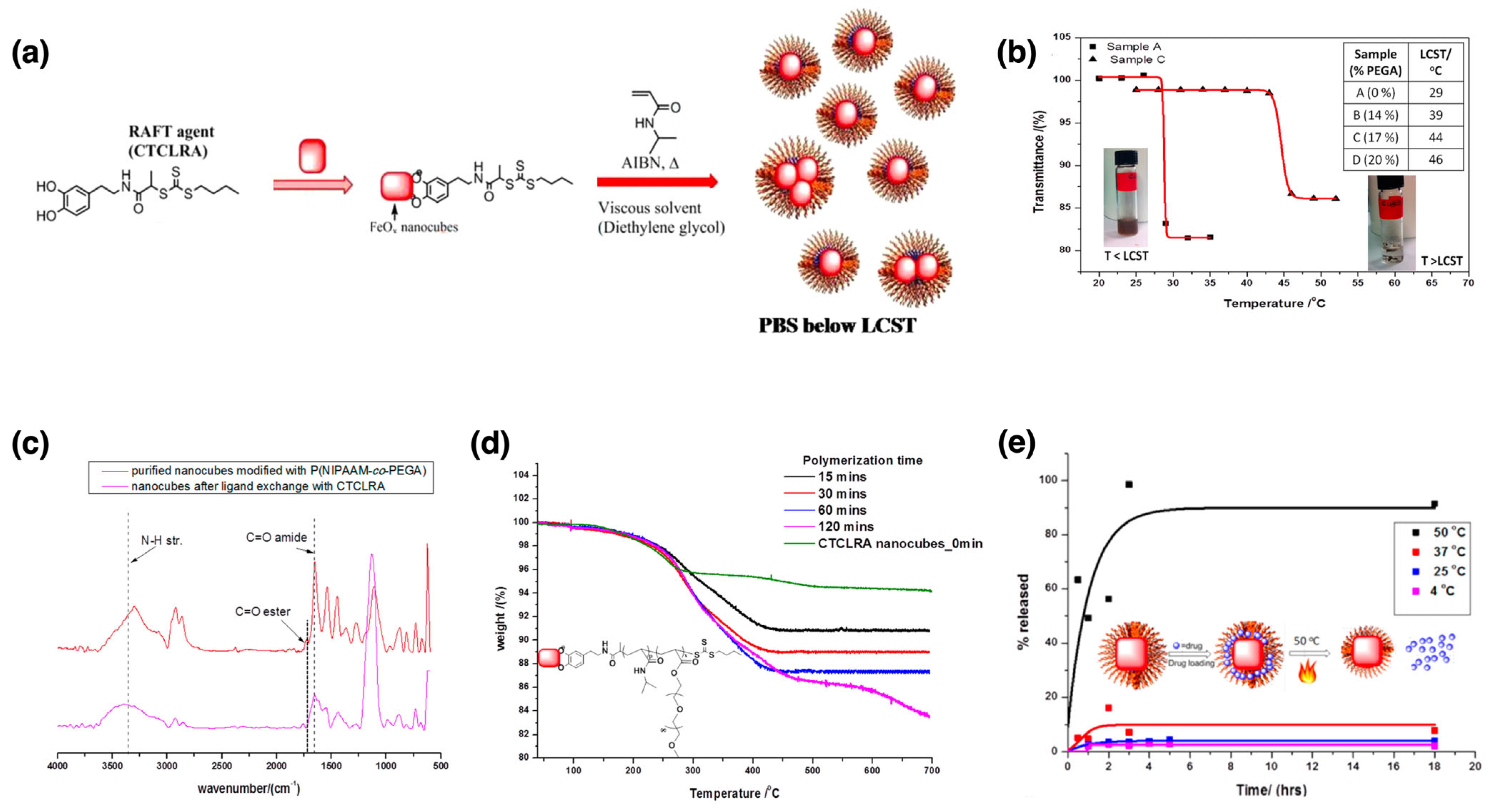 | Fe3O4 NPs | PNIPAAM | RAFT | Grafting from | Hyperthermia | [171] |