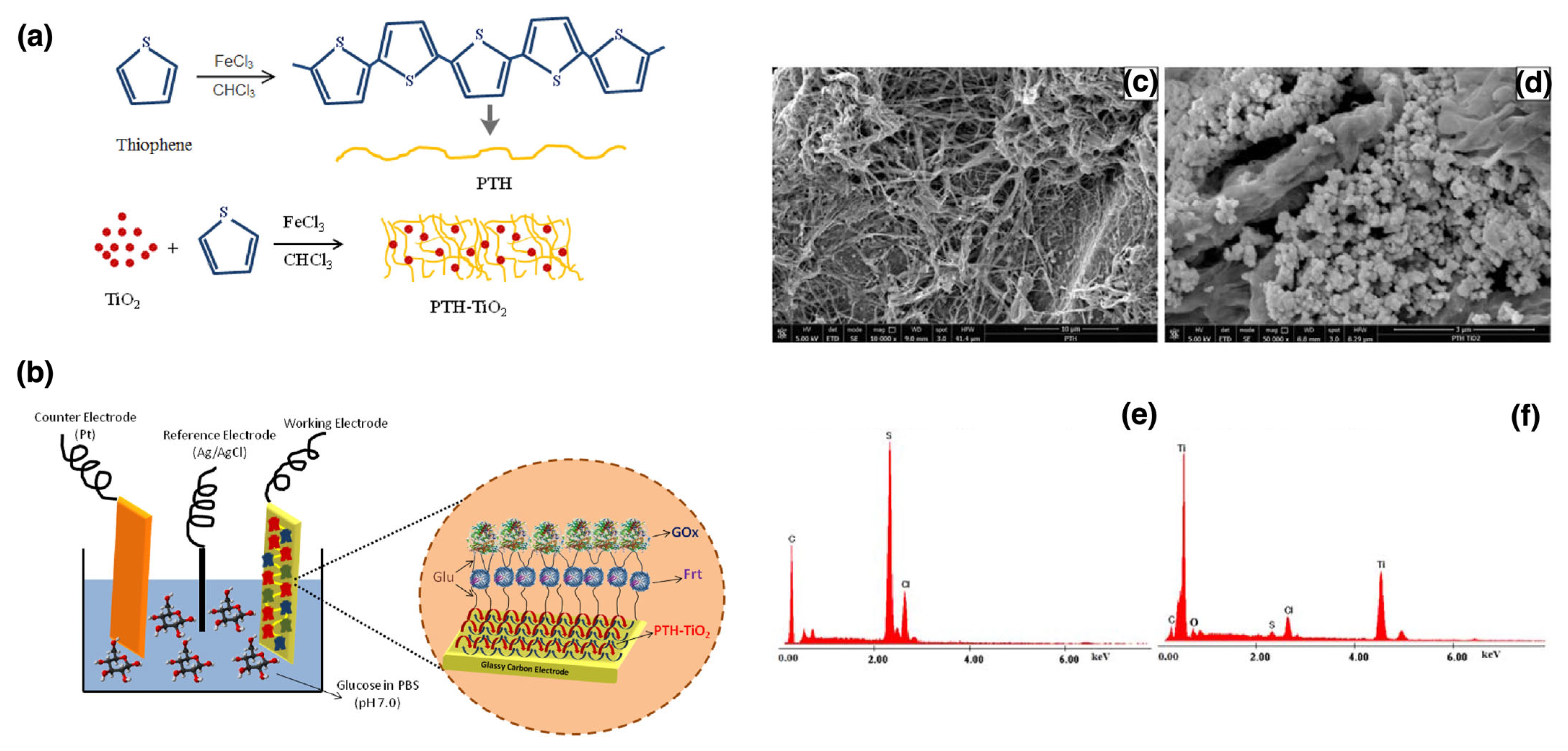 | Biomedical devices | TiO2 NPs | PTH | Grafting from | PTH-TiO2 nanocomposite: ~70–90 nm | Maintains ~88% activity (14 days) | Enhanced GOx-mediated bioanode performance; improved electron transport in BFCs | [173] |