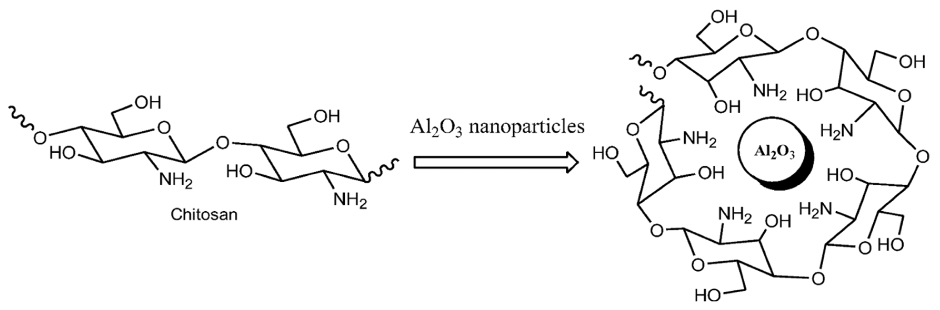 | Al2O3 NPs | Chitosan | N/A | Physisorption | Catalysis | [178] |