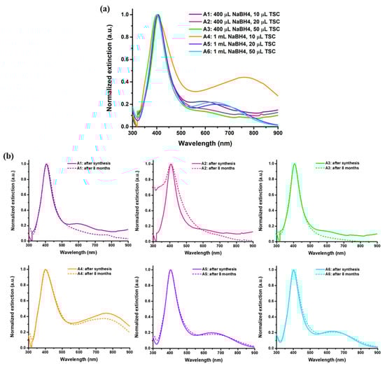 (a) LSPR spectra of the as-synthesized AgNPs in aqueous solution. (b) Normalized extinction spectra after synthesis compared to the extinction spectra recorded after 8 months from the growth of the nanoparticles, proving the stability of all colloidal AgNPs samples.