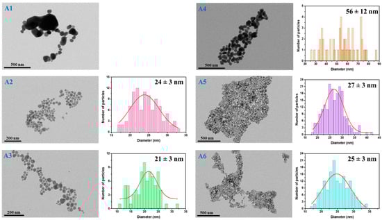 Furthermore, samples A2–A3 and A5–A6 exhibit similar LSPR band positions located at around 400–405 nm, suggesting the presence of nanosized nanoparticles with comparable diameters. These determinations are supported and confirmed by the particle size distribution histograms, as the diameter size varies between 27 and 21 nm with 3 nm standard deviations. A 30 μL increase in the TSC amount slightly decreases their size; however, the increase in the reducing agent leads to a higher yield of AgNPs. Therefore, according to TEM microscopy, synthesis A2 and A5, in which 20 μL of TSC were used, seems to be the most promising choice for further applications.