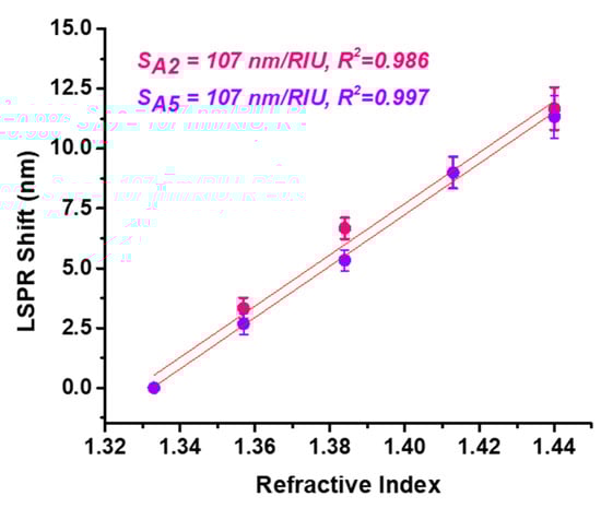 Lastly, the bulk refractive index sensitivity (RIS) of samples A2 and A5 was studied to determine their optical biosensing capabilities. Specifically, the sensitivity of the nanoparticles to changes in the microenvironment in the nanoparticles’ close vicinity was evaluated. For this aim, the dielectric medium of the nanoparticles previously in aqueous solution was changed with water–glycerol mixtures of different concentrations, i.e., 0, 20, 40, 60 and 80% glycerol. The LSPR property of metallic nanoparticles is dependent on the refractive index of the medium in which the nanoparticles are located; thus, an increase in the refractive index leads to a red-shift in the LSPR band. By employing different water–glycerol mixtures, the refractive index was changed from 1.333 corresponding to water to 1.44 corresponding to an 80% glycerol concentration. The LSPR response was monitored for each glycerol concentration, followed by the extraction of their spectral positions. With an increasing refractive index, the LSPR of the A2 sample red-shifted up to 8 nm for the 80% water–glycerol mixture, whereas for A5 the extinction band was translated to higher wavelengths with 12 nm, exhibiting higher sensitivity to refractive index changes in the microenvironment in the AgNPs’ proximity. Further, the LSPR red-shift with respect to 0% glycerol concentration was plotted as a function of the refractive index (Figure 6). From the obtained linear regressions, the RIS values for AgNPs were extracted as the slope of the fitted lines resulting in RIS of 107 nm/RIU for both samples. The R2 coefficients show the good correlation of the fit. These results prove the strong influence of the synthesis parameters and the need to optimize the methods applied in order to achieve the best results for further biosensing applications.