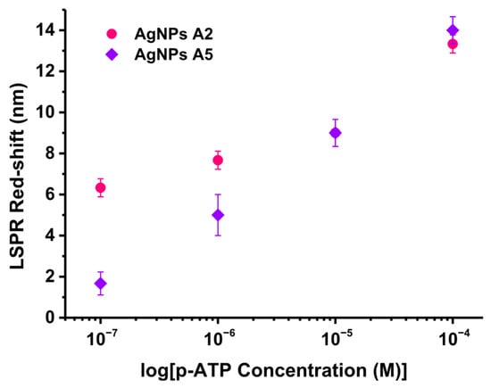 Finally, the biosensing capabilities of the A2 and A5 AgNPs samples were tested. p-ATP, a small well-known molecule, was chosen to be grafted onto the AgNPs due to its thiolated active functional group which binds to the metallic surface. Concretely, the AgNPs were exposed to various ethanolic p-ATP concentrations from 10−4 to 10−7 M, followed by the recording of their extinction spectra. The biosensing test was realized in triplicate. From the comparison to the LSPR responses of the unfunctionalized AgNPs, the LSPR red-shifts were extracted and graphically represented with respect to the p-ATP tested concentrations (Figure 7). The functionalization with p-ATP induced red-shifts from 13 nm for the highest concentration to 6 nm for the lowest concentration in the case of AgNPs sample A2, while for sample A5 the red-shifts varied from 14 nm (highest concentration) to 2 nm (lowest concentration). Both samples showed LSPR biosensing capabilities; however, sample A2 shows better performances compared to A5, indicating that concentrations below 10−7 M can be achieved.