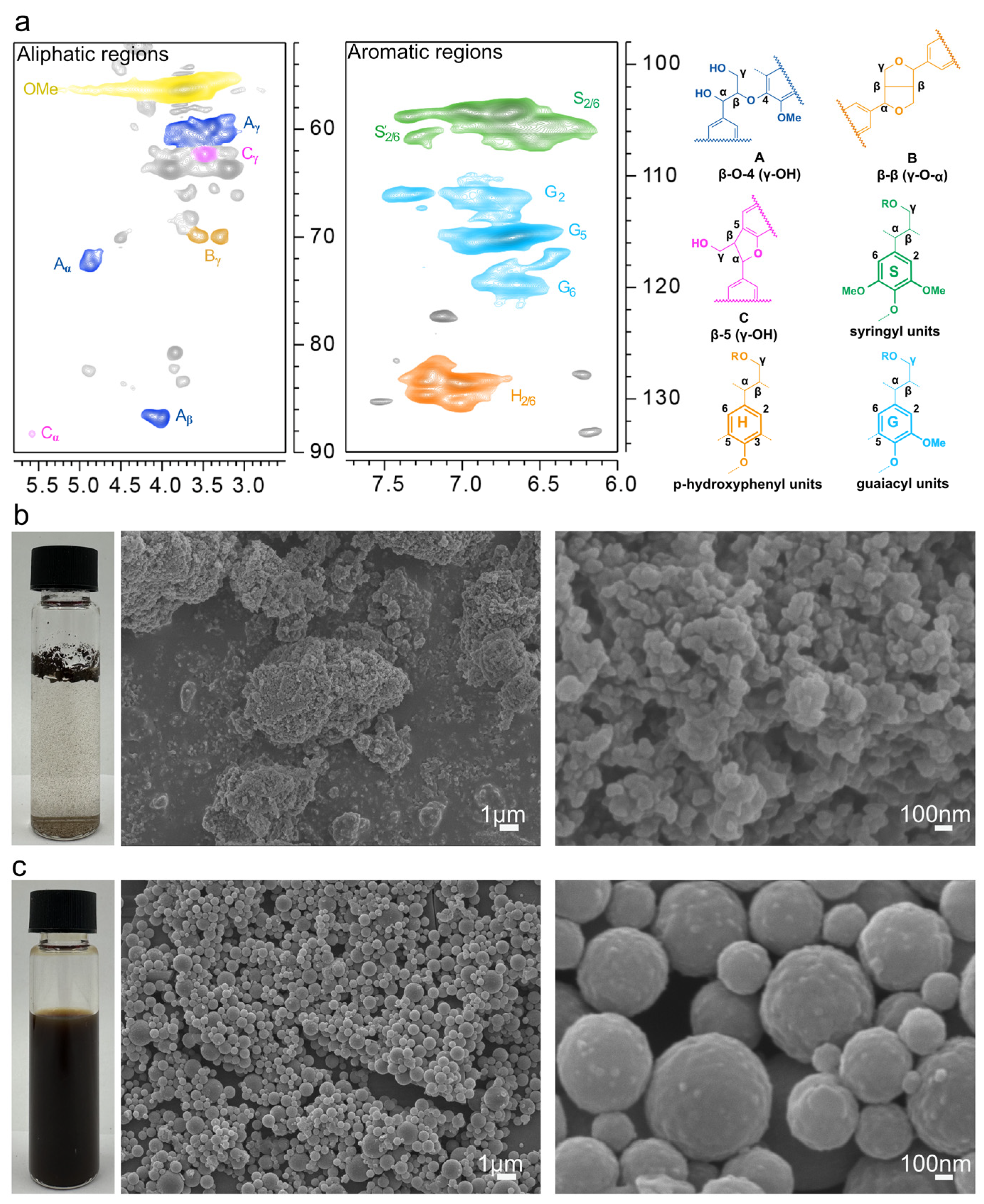 Figure 1c displays the sample as a uniform dark liquid with good dispersion. The SEM image on the right side shows that the particles are regularly spherical, indicating that the morphology and dispersion of the lignin particles have been significantly improved following the specific treatment.