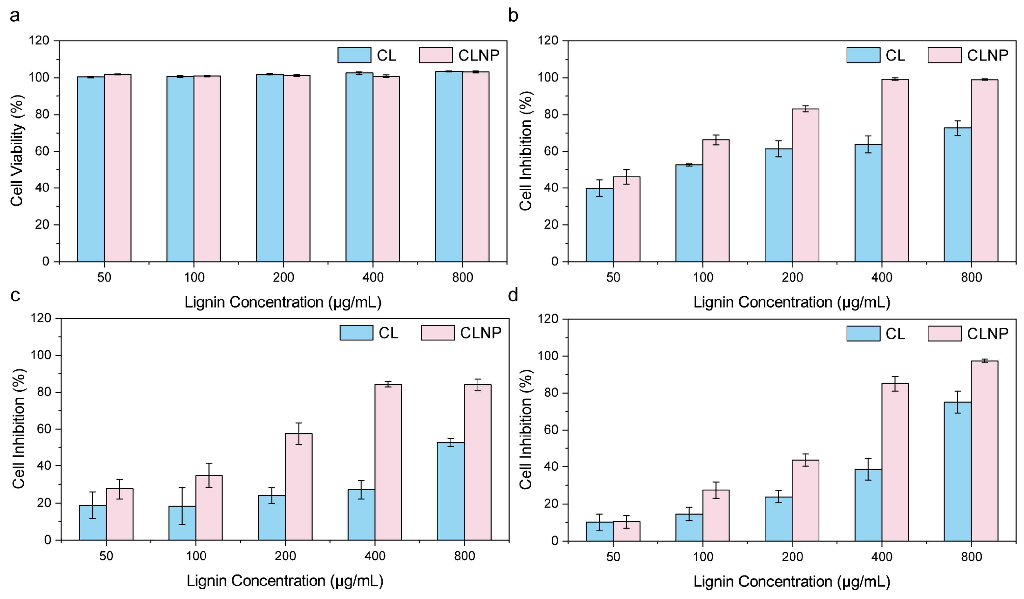 4]. (2) The nanoscale structure is more adept at penetrating biological barriers, such as the abnormal blood vessel walls of tumor tissues and cancer cell membranes. Additionally, cancer cells exhibit stronger endocytosis of nanoparticles, facilitating the entry of more lignin active ingredients into the cell interior, where they can directly target key components (e.g., cell nuclei, mitochondria) to inhibit proliferation or induce apoptosis [